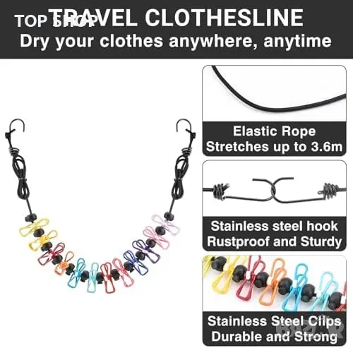 Ретрактилно въже за сушене: Удължава се до 3,6 м и лесно се прибира. Издръжливи куки и щипки за сигурно закрепване.