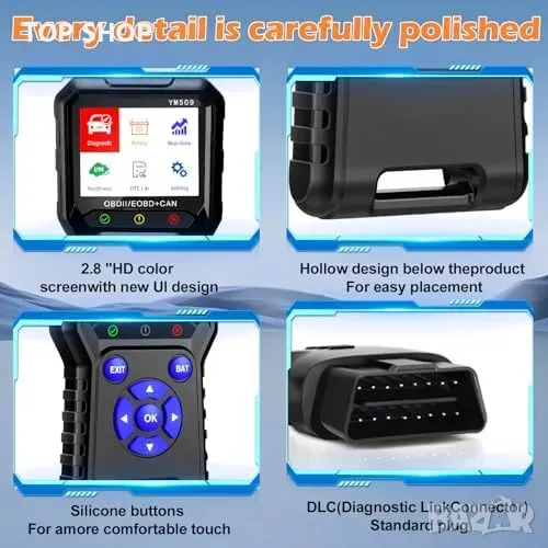 10 OBDII функции: Четене и изчистване на кодове, тест на батерията, O2 сензор и още.