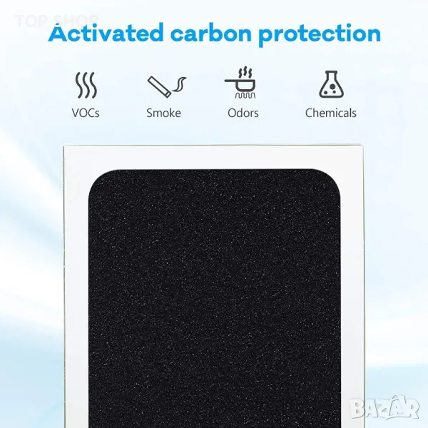 Проектиран е да абсорбира днешните обикновени газообразни замърсители като летливи органични съединения (ЛОС), отработени газове, смог, миризми, дим и химикали във въздуха чрез големи количества активен въглен. Идеален за използване в помещения, където се изисква постоянно отстраняване на такива замърсители.