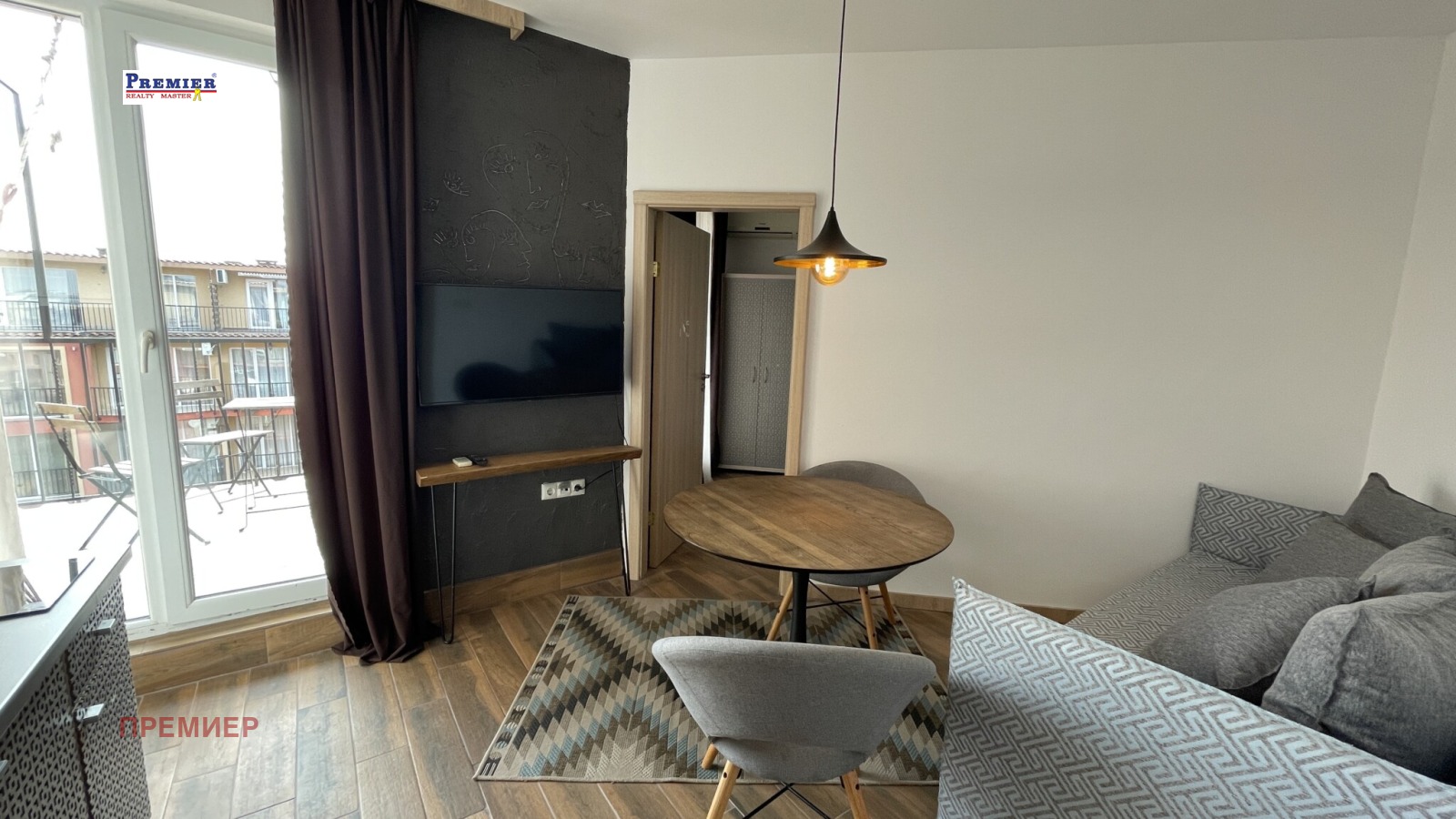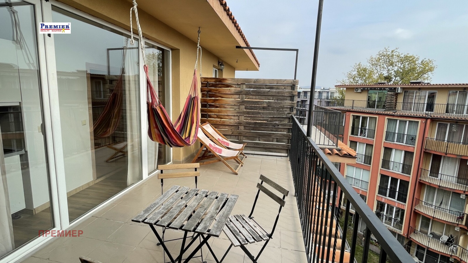 м. Продава се обзаведен. Тераса. Комплексът е разположен близо до плажа на 400 м. разполага с басейн и външни душове. Детски басейн и детска площадка. Фитнес център. Фойе с бар и места за отдих. Такса поддръжка: 12 евро / кв.м
