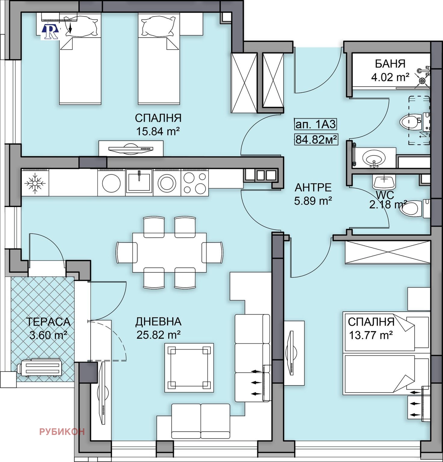 Разпределението на апартамента е както следва: просторна дневна с кухненски бокс(25.82.м), спалня(15.84кв.м.), спалня(13.77кв.м.), баня с тоалетна(4.02кв.м), тоалетна(2.18кв.м), антре(5.89кв.м), тераса(3.60кв.м). Застроена площ(84.82кв.м.). Общо площ (103.35кв.м.). Изложение - Юг/Запад! Към жилището имате възможност да закупите и паркомясто , което се заплаща допълнително.