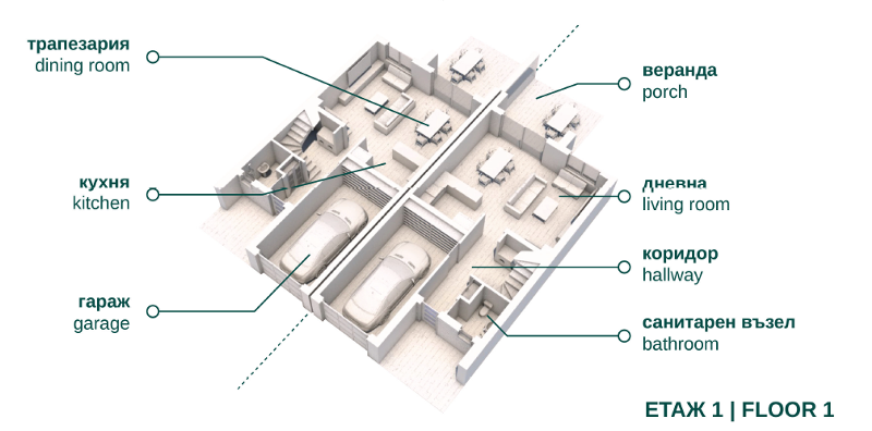 Етаж 1 - Гараж, Коридор, Дневна с трапезария и кухня, санитарен възел и веранда.