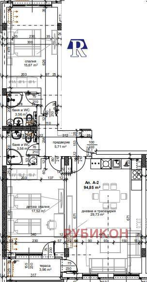 Апартаментът се състои от антре, просторна дневна с трапезария и кухненски бокс(29.73кв.м), спалня(17.52кв.м),спалня(15.67кв.м), две бани с тоалетни(по 3.56кв.м) и две тераси(3.96кв.м и 3.34кв.м). Обща площ 111.25 кв.м. (застроена площ 94.85 кв.м. + общи части 16.4 кв.м.). Маза - 3.47кв.м. Изложение - Север/Юг! Прекрасно и функционално жилище, проектирано с много нисък процент на общи части от сградата и перфектно разпределение! Сградата се изпълнява с висококачествени материали и съвременни технологии, по европейски стандарт. Утвърден строител с множество завършени и въведени в експлоатация обекти в гр. Пловдив. Предлагат се и паркоместа и гаражи.