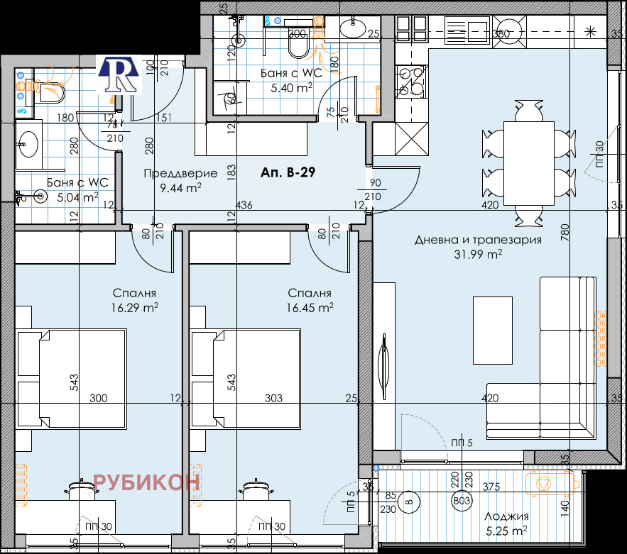 Жилището е разпределено както следва: просторна дневна с обособен кухненски бокс(31.99кв.м), спалня(16.45кв.м.), спалня(16.29кв.м.),антре(9.44кв.м.), баня с тоалетна(5.40кв.м.), баня с тоалетна(5.04кв.м.) и лоджия(5.25кв.м.). Сградата се изпълнява с висококачествени материали и технологии тухли Winerberger, цветна PVC дограма, графитна топлоизолация, асансьора, луксозни общи части, външни блиндирани врати и контрол на достъп в сградата. Апартаментът е отлична инвестиция, а също перфектен избор за живеене в градска среда. В нашия екип(Рубикон) имаме специалисти с високи компетенции - юристи, икономисти, инженери, като нашата цел е по най-добрия начин да защитим интересите на нашите клиенти. Рубикон ООД предлага всички необходими юридически и технически проверки на имота, организира всички етапи на сделка за покупко-продажба или наемни отношения до нейното финализиране с нотариално прехвърляне на имота. Съдейства за отпускане на банкови кредити при възможно най-добри условия за клиента. Рубикон ООД е регистрирана по ЗЗЛД като администратор на лични данни, което гарантира сигурността на клиентите. Адресът на офиса ни в Пловдив е бул.Източен 47, етаж 2, офис 7