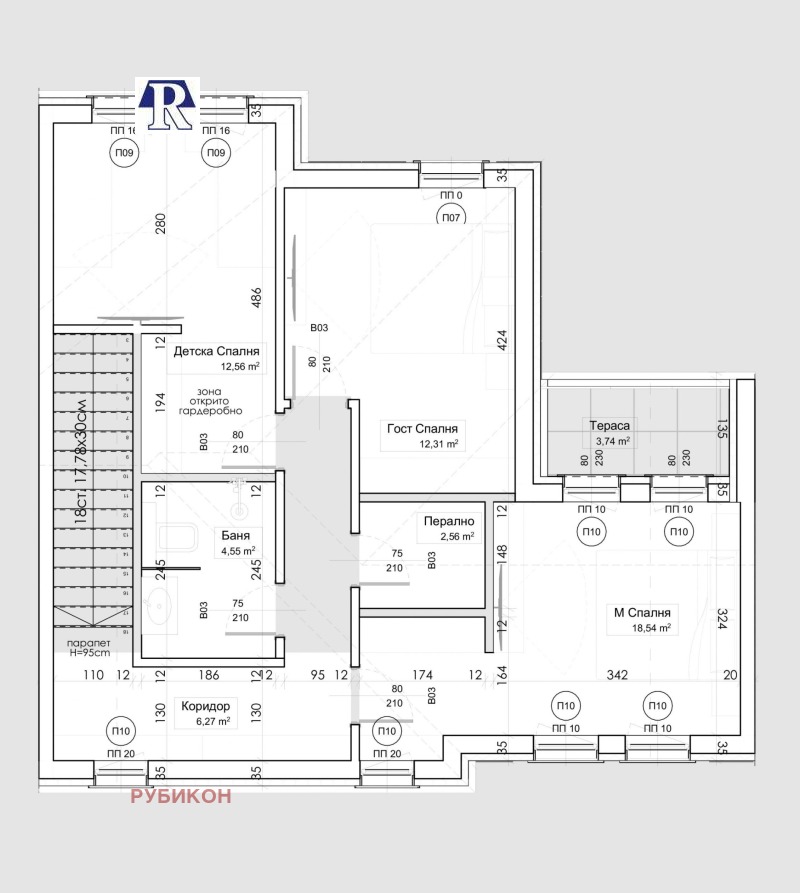 2-ри етаж : 3 отделни спални (18.54кв.м. ; 12.56кв.м. и 12.31кв.м.), тераса 3.74кв.м. , коридор 6.27кв.м. и баня с тоалетна 4.55кв.м. Застрена площ на етаж 1 - 64,98 кв.м. Застрена площ на етаж 2 79,24 кв.м. Разгъната застроена олощ - 144,22 кв.м. Изложение Север/Юг!
