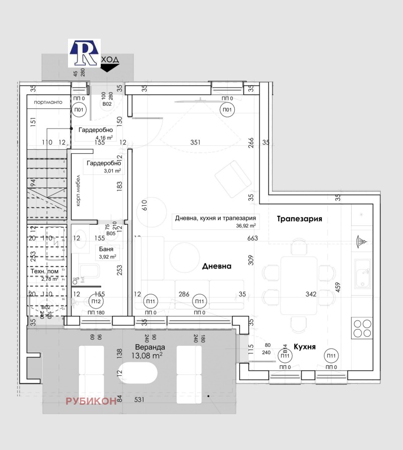 1 етаж - голям хол с кухня и трапезария 36.92кв.м кв.м, баня 3.92кв.м, с тоалетна, гардеробни 4.16кв.м. и 3.01кв.м., веранда 13.08кв.м.;