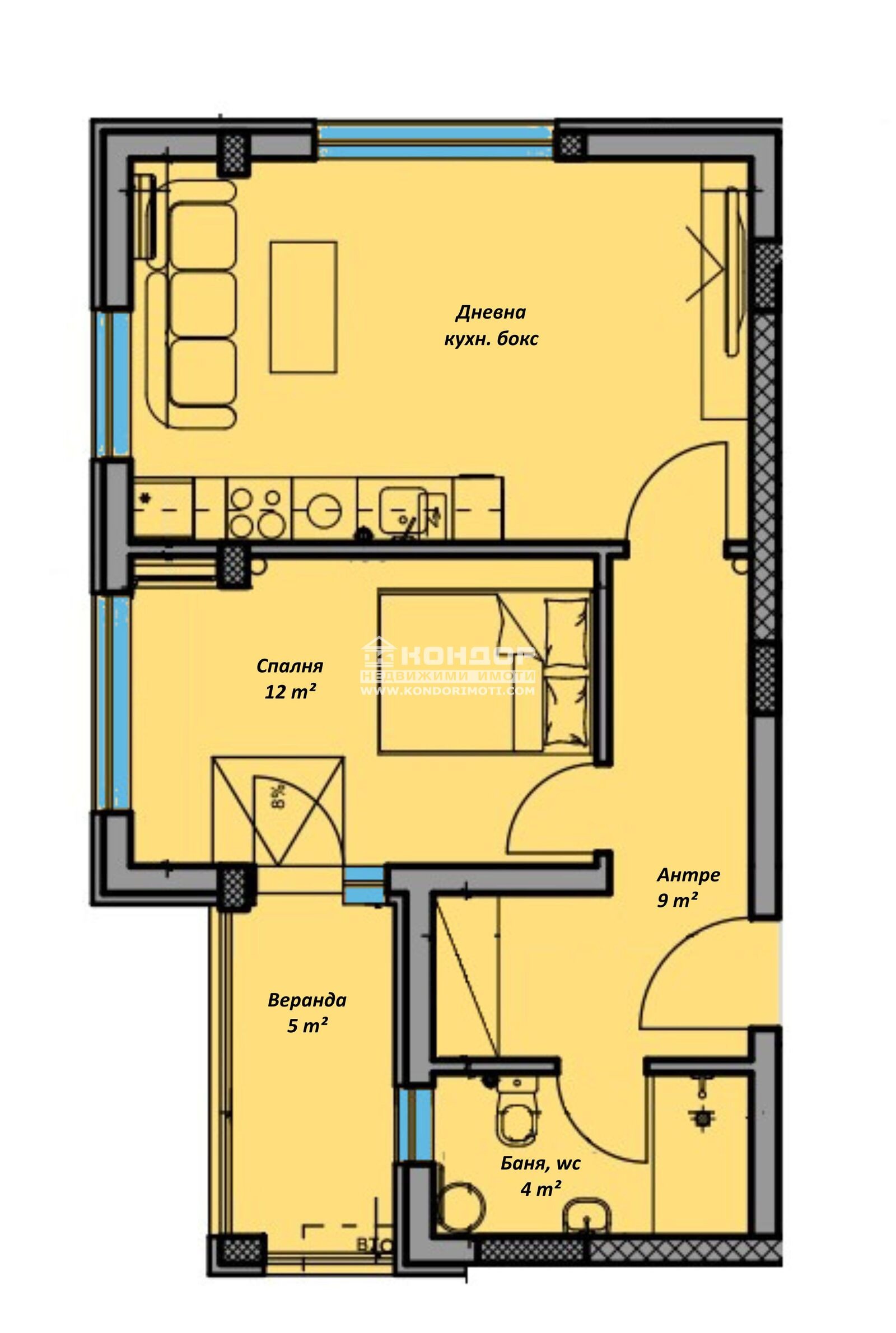 Разпределение: Апартаментът се състои от ъглова дневна с трапезария + кухненски бокс, самостоятелна спалня 12кв.м., баня с тоалетна, входно антре с място за гардероб и една веранда.