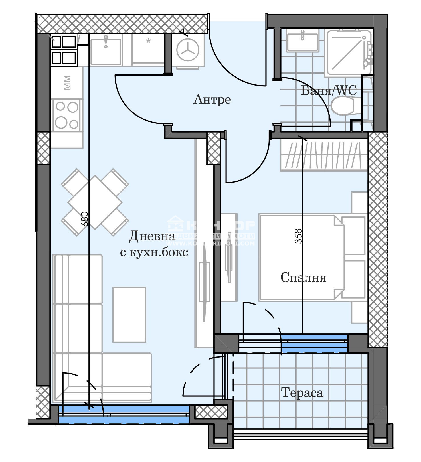 Оферта 66562: Предлагаме Ви възможността да закупите вътрешен 2-стаен апартамент в новоизграждащ се луксозен жилищен комплекс с модерна визия, проектиран да създаде максимален комфорт на живущите в него. Tри хоризонтално разположени жилищни секции с елегантен силует готов да предложи комфорт и модерен начин на живот.Едно от основните му предимства е страхотната локация, отлична комуникативност и динамична пътна инфраструктура, която осигурява бърз и лесен достъп до комплекса, от всяка точка на града. Той съчетава лукс, спокойствие и комфорт, с подсигурени паркоместа и гаражи. Жилището се състои от дневна с кухненска част, спалня, баня с тоалетна, тераса и прилежащо избено помещение. Основната концепция при проектирането е да се постигнат просторни и функционални стаи, с цел да се създаде максимален уют на модерното семейство. Изключителна съвременна архитектура и модерна технология на строителство. Визията е иновативна, привличаща внимание с уникалността си. Всяко жилище ще разполага с пълно окабеляване за домофон, интернет и кабелна телевизия, общите части са луксозно завършени, жилищата са с алуминиева дограма с троен стъклопакет от най-висок клас, масивна блиндирана входна врата. За удобство на живущите съществува възможността да закупят подземни паркоместа и гаражи с топла връзка към комплекса. Гъвкави схеми на разсрочено плащане спрямо възможностите на клиента в рамките на строителството или закупуване чрез Банков Кредит, на изключително изгодни условия за клиенти на агенцията !!!ВИЖТЕ ОЩЕ ИЗГОДНИ ОФЕРТИ НА https://www.kondorimoti.com/ С ЕЖЕДНЕВНА АКТУАЛИЗАЦИЯ!
