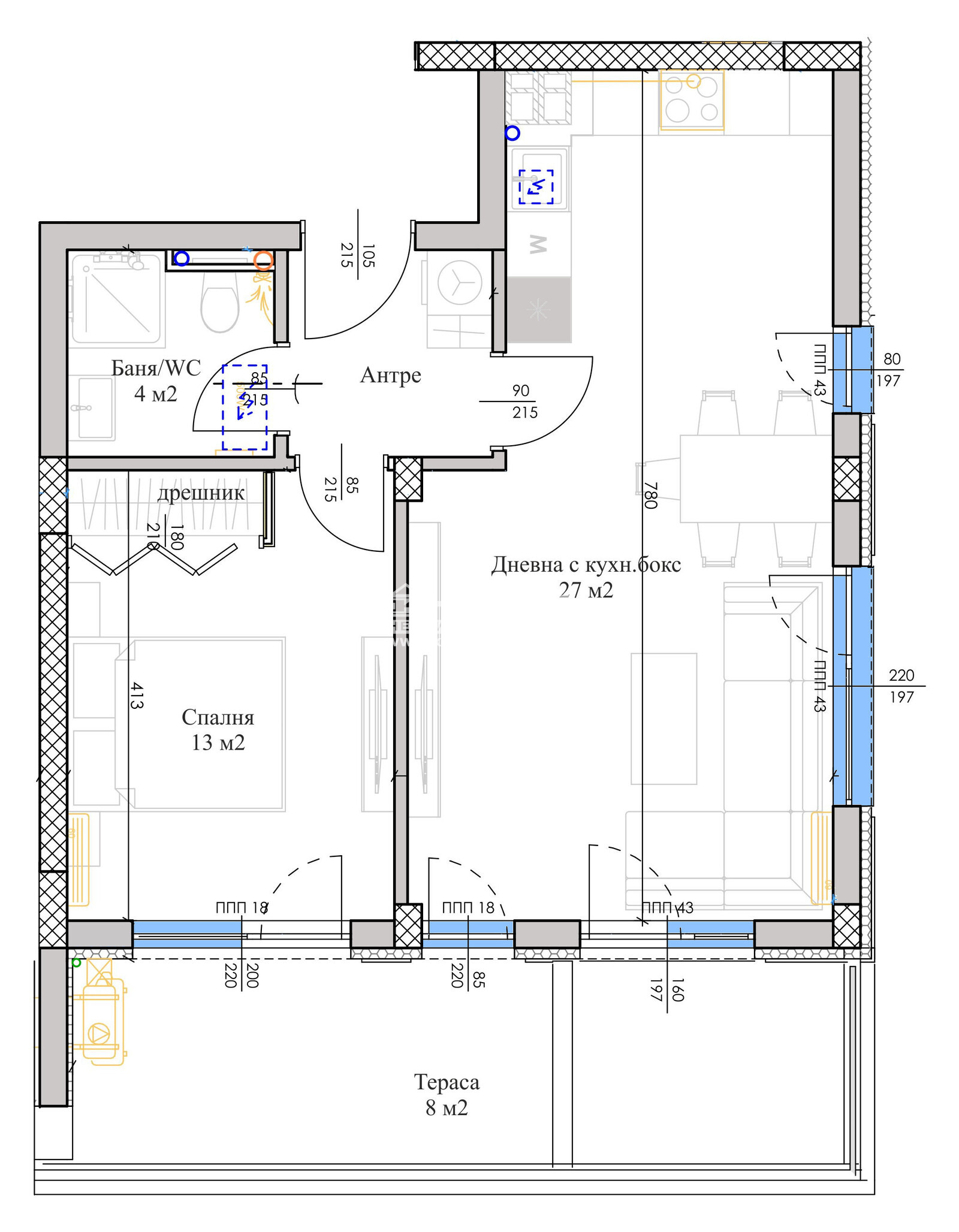 Разпределения - Просторни и многофункционални апартаменти с големи стаи и гледка към Родопите, а също и с партерни жилища с двор. Апартаментът, който Ви предлагаме се състои от страхотна ъглова дневна с кухненски бокс 27 кв.м., самостоятелна спалня с килер 13 кв.м., баня с тоалетна, антре и прекрасна тераса 8 кв.м.