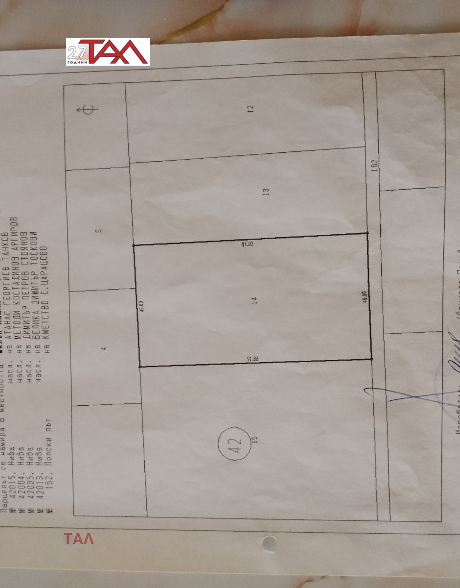 Агенция ТАЛ предлага земеделска земя в землището на с. Царацово, местност 'Малък Азмак' , нива , четвърта категория , 4500квм, близо до конната база.