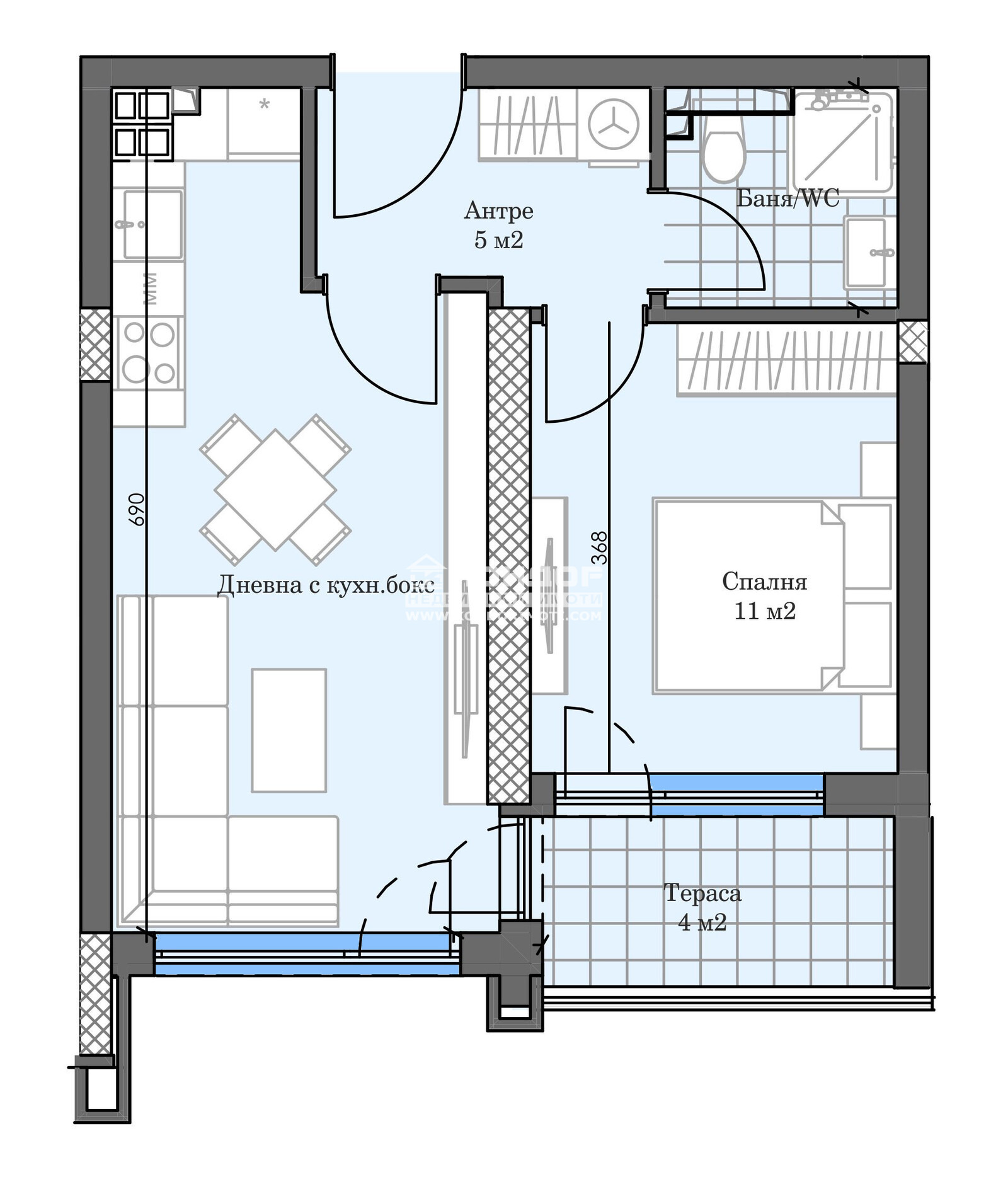 Оферта 66546: Предлагаме Ви възможността да закупите 2-стаен апартамент в новоизграждащ се луксозен жилищен комплекс с модерна визия, проектиран да създаде максимален комфорт на живущите в него. Tри хоризонтално разположени жилищни секции с елегантен силует готов да предложи комфорт и модерен начин на живот.Едно от основните му предимства е страхотната локация, отлична комуникативност и динамична пътна инфраструктура, която осигурява бърз и лесен достъп до комплекса, от всяка точка на града. Той съчетава лукс, спокойствие и комфорт, с подсигурени паркоместа и гаражи. Жилището се състои от дневна с кухненска част, спалня, баня с тоалетна, антре и тераса. Основната концепция при проектирането е да се постигнат просторни и функционални стаи, с цел да се създаде максимален уют на модерното семейство. Изключителна съвременна архитектура и модерна технология на строителство. Визията е иновативна, привличаща внимание с уникалността си. Всяко жилище ще разполага с пълно окабеляване за домофон, интернет и кабелна телевизия, общите части са луксозно завършени, жилищата са с алуминиева дограма с троен стъклопакет от най-висок клас, масивна блиндирана входна врата. За удобство на живущите съществува възможността да закупят подземни паркоместа и гаражи с топла връзка към комплекса. Гъвкави схеми на разсрочено плащане спрямо възможностите на клиента в рамките на строителството или закупуване чрез Банков Кредит, на изключително изгодни условия за клиенти на агенцията !!!ВИЖТЕ ОЩЕ ИЗГОДНИ ОФЕРТИ НА https://www.kondorimoti.com/ С ЕЖЕДНЕВНА АКТУАЛИЗАЦИЯ!