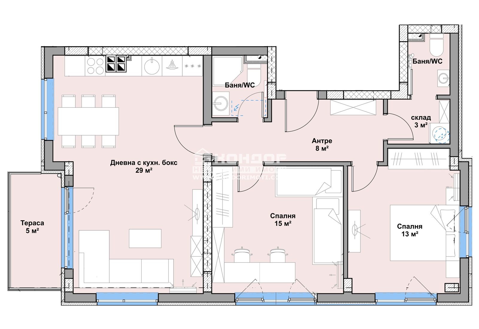 Оферта 63101: МАЛКА БУТИКОВА СГРАДА !!! Предлагаме ви тристаен апартамент с перфектно разпределение в новоизграждаща се сграда на комуникативно и спокойно място за живеене в квартал ХРИСТО СМИРНЕНСКИ в непосредствена близост до Гребна База. Жилището се състои от югоизточна просторна дневна 29 кв.м. с трапезария и кухненски бокс, две големи самостоятелни спални: родителска 13кв.м. и детска 15кв.м., две бани с тоалетна, перално, широко антре с място за вграден гардероб и една тераса. Кооперация с модерна архитектура, за чийто строеж се използват висококачествени материали и луксозно изпълнение. Стилната визия на фасадата ще бъде изпълнена с топлоизолация EPS, външна силиконова мазилка и HPL панели, LED осветление по контура на покрива. Общите части се отличават с креативни и стилни решения - стълбище с гранит, хидравличен асансьор, алуминиеви парапети. Апартаментите се предлагат в следният завършен вид: PVC пет камерна дограма с дървесен цвят, външна блиндирана врата. Хидравличен асансьор. Свободни гаражи !!! Закупуването на жилището може да се осъществи чрез БАНКОВ КРЕДИТ с преференциални условия за клиенти на Агенция Кондор!!! Приложените изображения са от готови сгради на строителната компания!ВИЖТЕ ОЩЕ ИЗГОДНИ ОФЕРТИ НА https://www.kondorimoti.com/ С ЕЖЕДНЕВНА АКТУАЛИЗАЦИЯ!