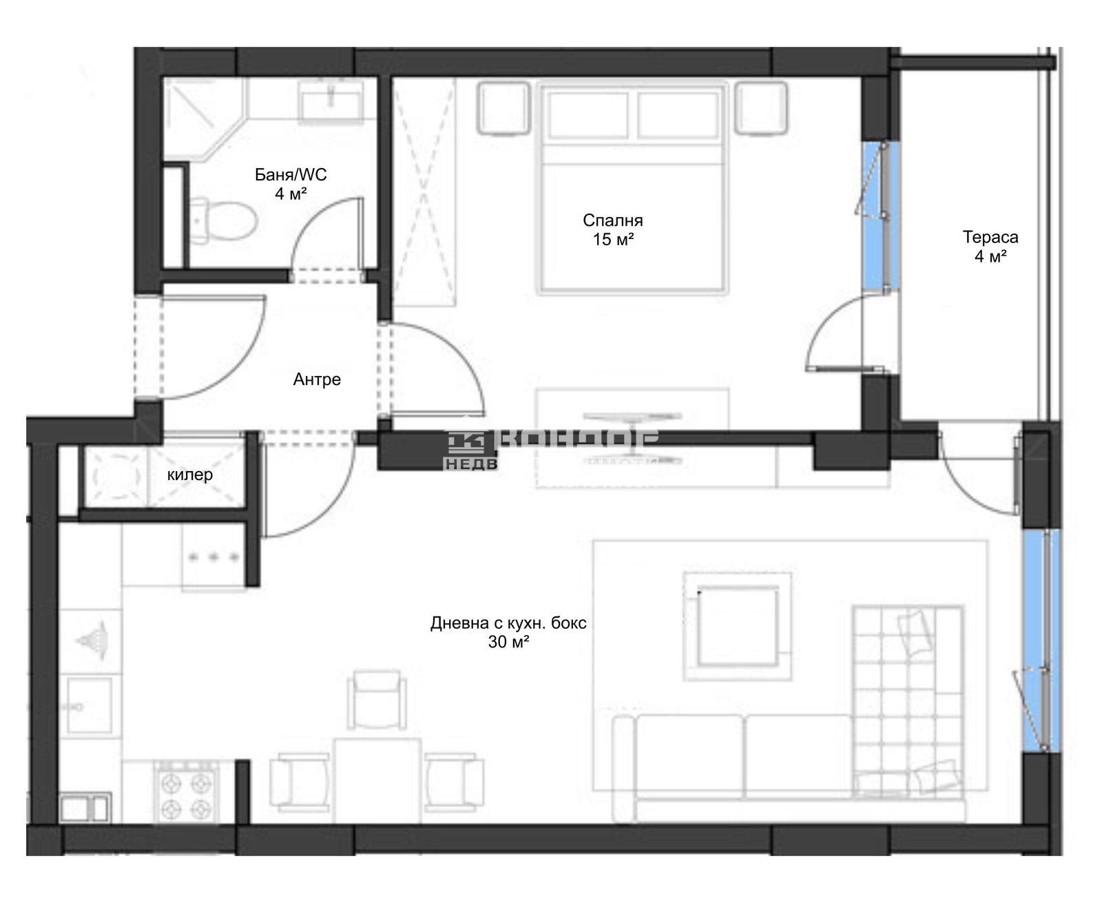 Оферта 61993: Нова луксозна сграда, намираща се на чудесно място в близост до централната част на квартала, съчетаваща в себе си модерната архитектура с високо качество на строителство и усещането за уют и спокойствие. Намира се в най-атрактивния и предпочитан за живеене и инвестиция квартал на Пловдив Кючук Париж, с отлична локация, в близост до училища, детски градини и всички необходими комуникации за нуждите на модерния човек. Жилището, което ви предлагаме е с изцяло ИЗТОЧНО изложение и се състои от дневна 30кв.м. с трапезария и кухненски бокс, една голяма самостоятелна спалня 15кв.м., баня с тоалетна, склад, входно антре и една тераса обща за двете стаи. Степен на завършеност: стени и тавани - шпакловка, под - циментова замазка, балкони - гранитогрес, мокри помещения-замазка и мазилка,