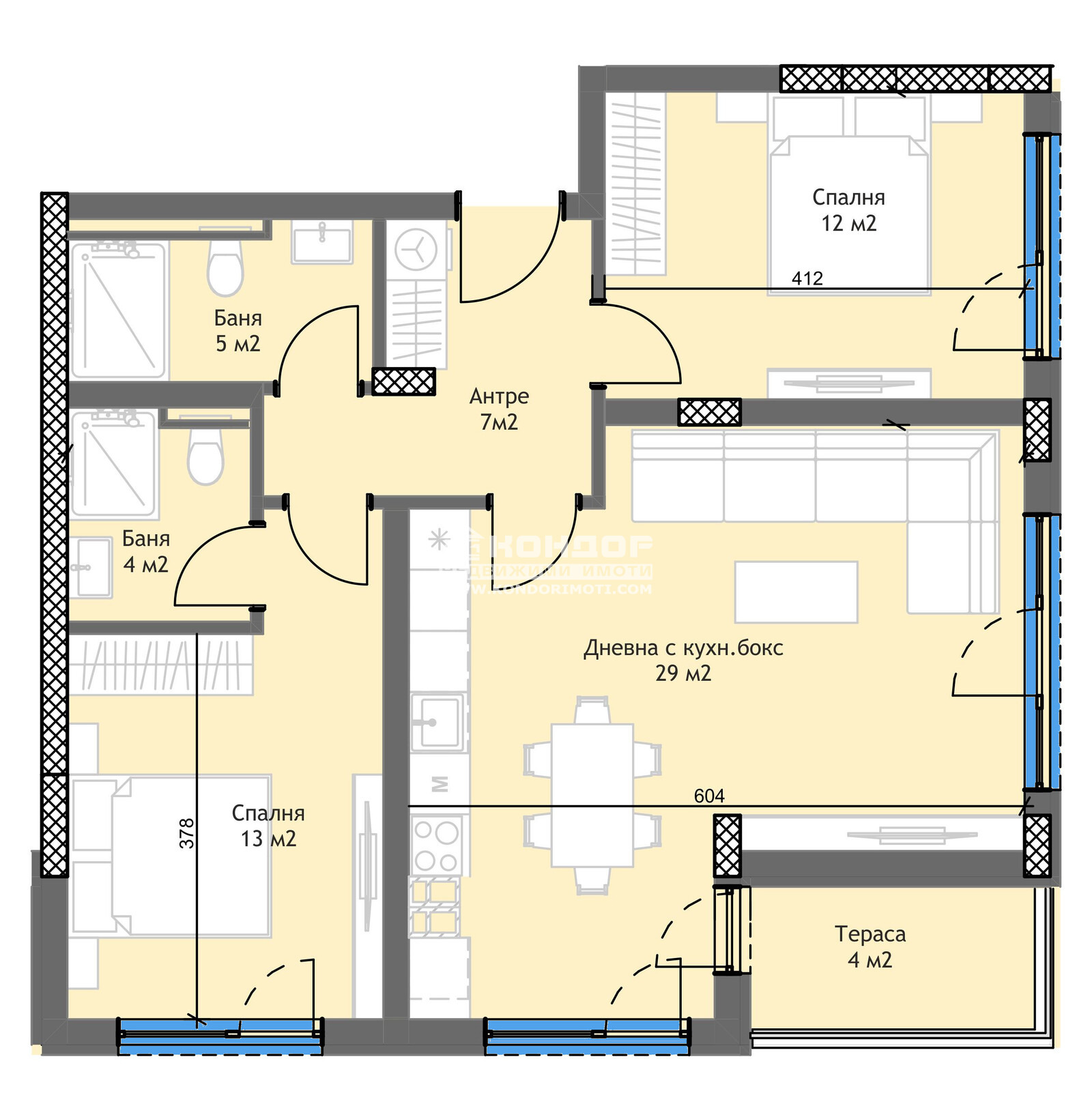 Оферта 64832: Предлагаме Ви възможността да закупите 3 - стаен апартамент с изложение юг/изток в новоизграждащ се луксозен жилищен комплекс с модерна визия, проектиран да създаде максимален комфорт на живущите в него. Функционално разположени жилищни секции с елегантен силует готов да предложи комфорт и модерен начин на живот. Едно от основните му предимства е страхотната локация, отлична комуникативност и динамична пътна инфраструктура, която осигурява бърз и лесен достъп до комплекса от всяка точка на града. Той съчетава лукс, спокойствие и комфорт с подсигурени паркоместа и гаражи. Жилището се състои от просторна югоизточна дневна/29 кв.м./ с кухненска част и трапезария, две самостоятелни спални: родителска 13кв.м. със собствена баня, детска 12кв.м., баня с тоалетна, входно антре с място за гардероб/перално и една тераса. Основната концепция при проектирането е да се постигнат просторни и функционални стаи, с цел да се създаде максимален уют на модерното семейство. Изключителна съвременна архитектура и модерна технология на строителство. Визията е иновативна, привличаща внимание с уникалността си. Всяко жилище ще разполага с пълно окабеляване за домофон, интернет и кабелна телевизия, общите части са луксозно завършени, жилищата са с алуминиева дограма с троен стъклопакет от най-висок клас, масивна блиндирана входна врата. За удобство на живущите съществува възможността да закупят подземни паркоместа и гаражи с топла връзка към комплекса. Гъвкави схеми на разсрочено плащане спрямо възможностите на клиента в рамките на строителството или закупуване чрез Банков Кредит, на изключително изгодни условия за клиенти на агенцията !!! Приложените изображения са от завършени проекти на строителната фирма.