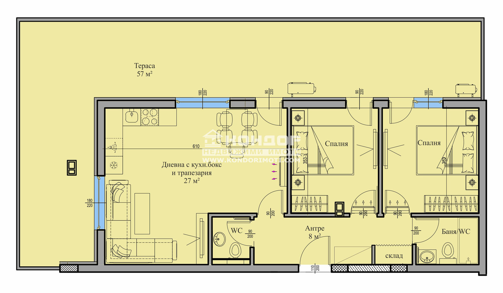 - Разпределение: Тристаен нов апартамент състоящ се от функционална дневна 27кв.м. с кухненски бокс и трапезария, две самостоятелни спални, баня с тоалетна, втори санитарен възел. входно антре с място за гардероб, склад и една панорамна тераса 50кв.м. с достъп от всички стаи.