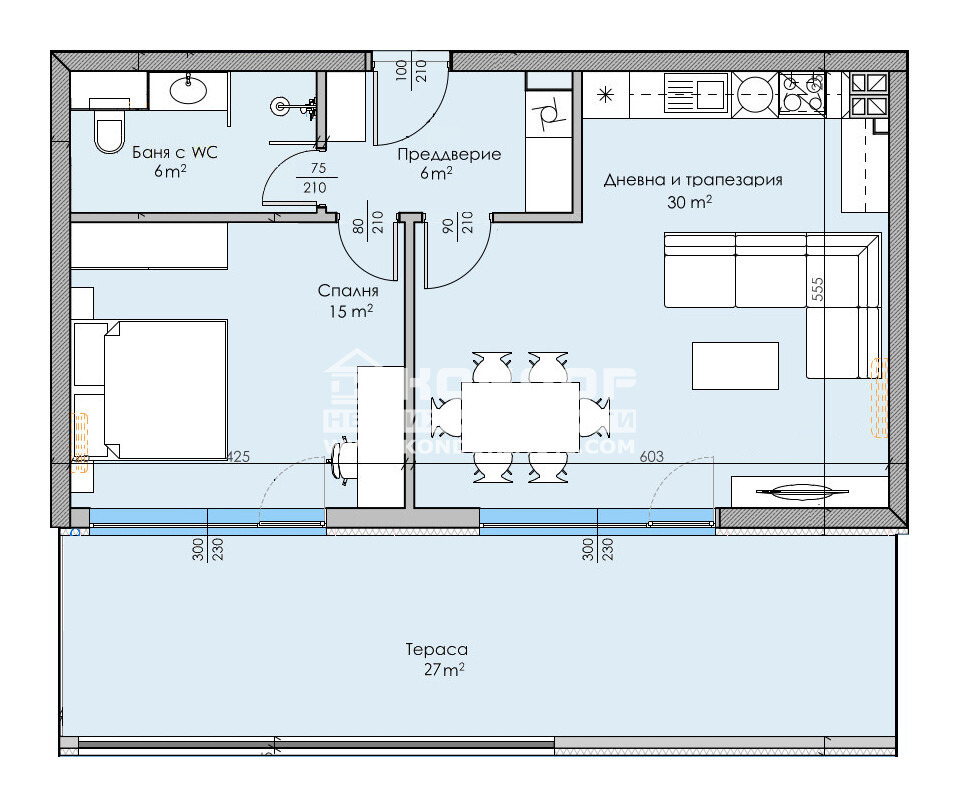 Оферта 62850: Предлагаме Ви възможността да закупите 2-стаен вътрешен апартамент с изцяло южно изложение в луксозна жилищна сграда с модерна визия, проектиран да създаде максимален комфорт на живущите в него. Основната концепция e премиум строителство, отличаващо се със съвременен архитектурен дизайн и европейска визия. Едно от основните му предимства е страхотната локация, разположен на пешеходна близост до Централна градска част, съчетаващо лукс спокойствие и комфорт. Жилището се състои от просторна дневна - 30кв.м. с трапезария и кухненски бокс, спалня - 15кв.м, една панорамна тераса 27кв.м., обща за двете стаи, голяма баня с тоалетна 6кв.м. и коридор. Към апартамента има прилежаща изба. Основната концепция при проектирането е да се постигнат просторни и функционални стаи с цел да се създаде максимален уют на модерното семейство. Изключителна съвременна архитектура и модерна технология на строителство. Визията е иновативна, привличаща внимание с уникалността си. Безопасна и сигурна среда за пребиваващите допълват комфорта на сградата. Всяко жилище разполага с пълно окабеляване за домофон, интернет и кабелна телевизия, общите части са луксозно завършени, а апартаментите са с алуминиева дограма с троен стъклопакет от най-висок клас, както и масивна блиндирана входна врата. За удобство на живущите съществува възможността да закупят подземни и надземни паркоместа. Възможност за закупуване чрез Банков Кредит на изключително изгодни условия за клиенти на Агенцията!