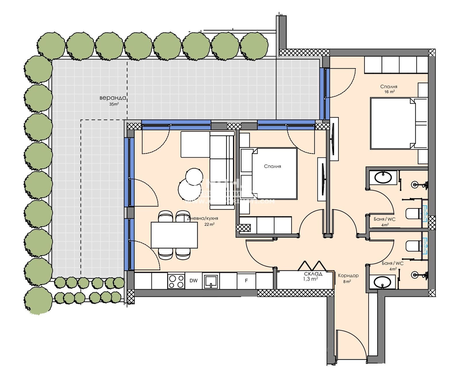 Оферта 66096: Представяме на Вашето внимание един проект на водеща фирма в изграждането на комплекси от затворен тип в град Пловдив. Строителната компанията акцентира върху комфорта, безопасността и сигурността в своите комплекси, естетичното оформление на пространството около сградите и отлично развитата инфраструктура, сред която умело да бъдат съчетавани работа, развлечения, спорт и почивка. Апартаментът, които ви предлагаме се състои от ъглова дневна с кухненска част 22кв.м., две самостоятелни спални: детска 14кв.м. и родителска 16кв.м. със собствена баня, втора баня с тоалетна, широко входно антре с място за перално и една веранда, обща за трите стаи. Най-новият проект на компанията е луксозен комплекс, който е разположен в северната част на град Пловдив, обграден от природа, която дава неподправено усещане за простор и спокойствие, с невероятна гледка към Родопите. Комплексът се базира на концепцията за извънградски комплекс, където в голям терен се разполагат по-малки жилищни сгради, които предлагат спокойствието в покрайнините на града. В сградите има жилища с една, две и три спални, единични и двойни подземни и надземни гаражи, както и външни паркоместа. На входа на всяка сграда е поставена система за индивидуален чип, високоскоростни асансьори, а вътрешнопарковото пространство е решено в богата висока и ниска растителност, заобиколена от живописни зеленина, детска площадка и площ за спорт. Благодарение на ниската си плътност на застрояване, архитектурния си дизайн и добрата ориентация, комплексът е предпочитано място, което осигурява на обитателите си спокоен и качествен живот. Осигурено Банково Финансиране с изключително Изгодни условия за клиенти на Агенцията от Водещи Банки !!!