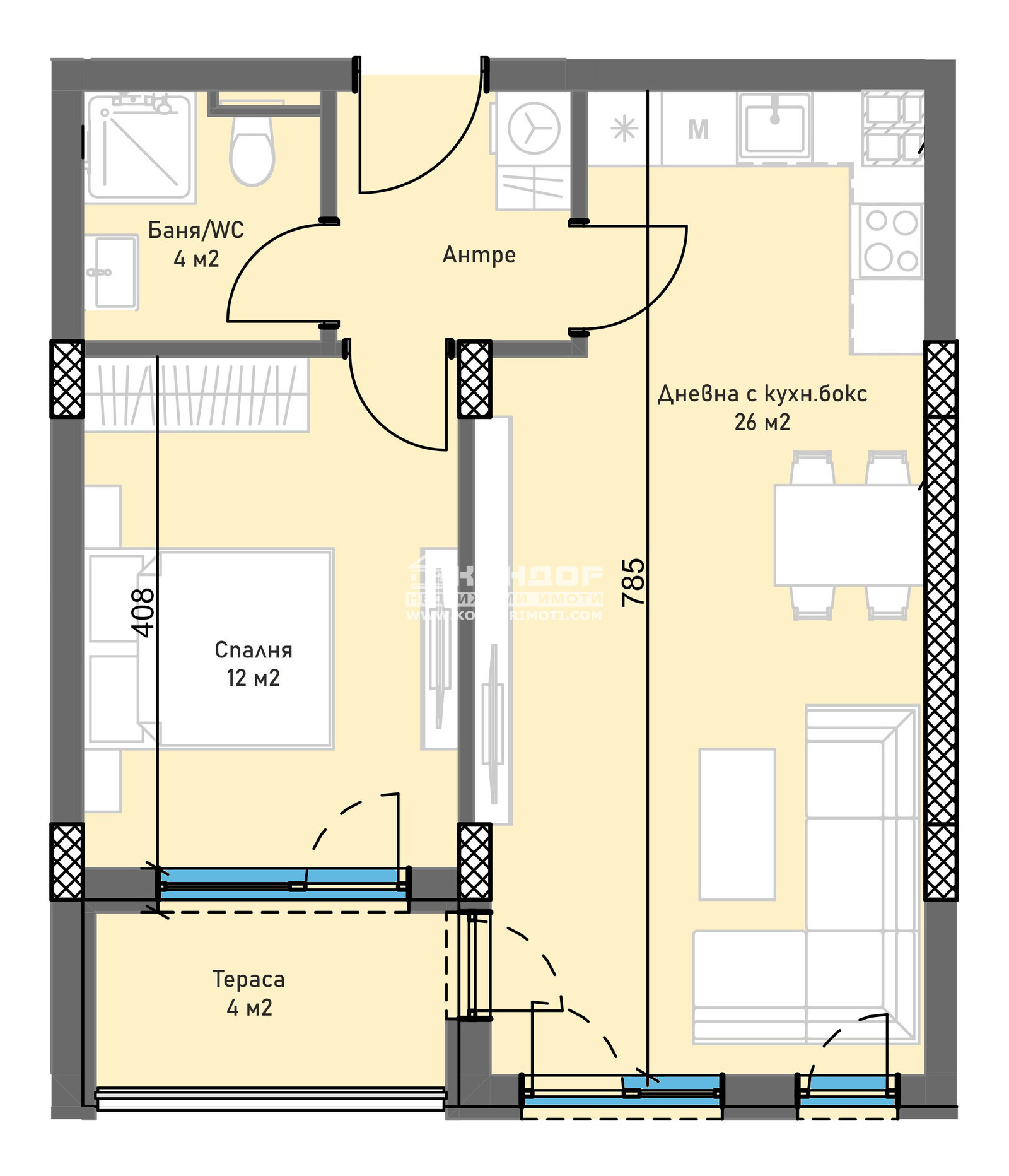 Оферта 64439: Предлагаме Ви възможността да закупите 2 - стаен ИЗЦЯЛО ЮЖЕН апартамент в новоизграждащ се луксозен жилищен комплекс с модерна визия, проектиран да създаде максимален комфорт на живущите в него. Функционално разположени жилищни секции с елегантен силует готов да предложи комфорт и модерен начин на живот. Едно от основните му предимства е страхотната локация, отлична комуникативност и динамична пътна инфраструктура, която осигурява бърз и лесен достъп до комплекса от всяка точка на града. Той съчетава лукс, спокойствие и комфорт с подсигурени паркоместа и гаражи. Жилището се състои от просторна дневна/26 кв.м./ с кухненска част и трапезария, една самостоятелна спалня 12,24кв.м., баня с тоалетна, входно антре с място за перално, веранда и една тераса обща за двете стаи. Към апартамента има избено помещение, включено в цената! Основната концепция при проектирането е да се постигнат просторни и функционални стаи, с цел да се създаде максимален уют на модерното семейство. Изключителна съвременна архитектура и модерна технология на строителство. Визията е иновативна, привличаща внимание с уникалността си. Всяко жилище ще разполага с пълно окабеляване за домофон, интернет и кабелна телевизия, общите части са луксозно завършени, жилищата са с алуминиева дограма с троен стъклопакет от най-висок клас, масивна блиндирана входна врата. За удобство на живущите съществува възможността да закупят подземни паркоместа и гаражи с топла връзка към комплекса. Гъвкави схеми на разсрочено плащане спрямо възможностите на клиента в рамките на строителството или закупуване чрез Банков Кредит, на изключително изгодни условия за клиенти на агенцията !!! Приложените изображения са от завършени проекти на строителната фирма.