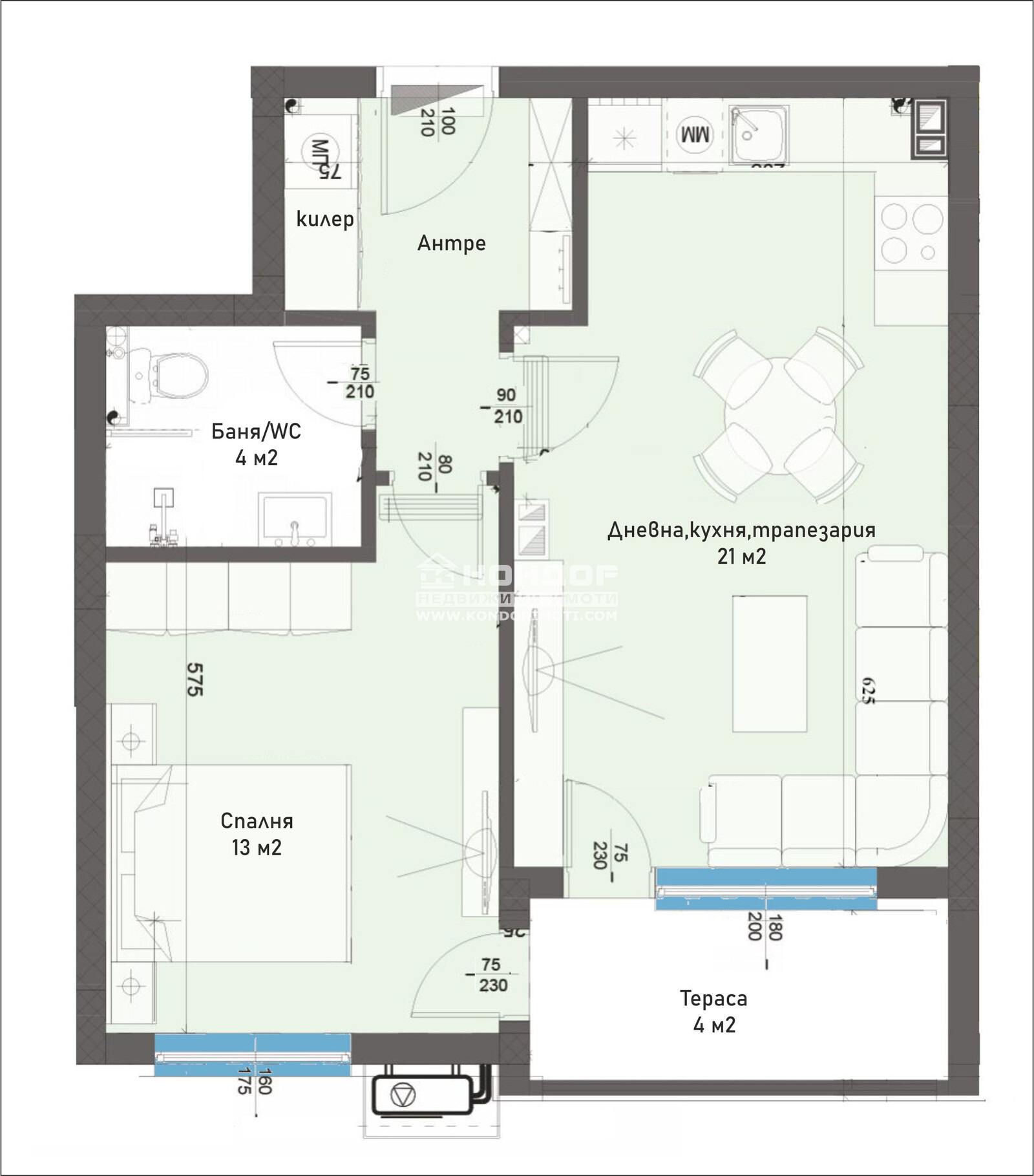 Оферта 63308: Бутиков затворен жилищен комплекс с модерна и устойчива архитектура, потопена в богато озеленени площи, вдъхващи на живущите комфорт и спокойствие. Комплекса предлага просторна спокойна среда с бърз достъп до центъра на града, както и възлови булеварди. Предлагаме ви вътрешен двустаен апартамент с ИЗЦЯЛО ЮЖНО изложение, състои се от дневна с трапезария и кухненска част, една самостоятелна спалня 13кв.м., баня с тоалетна, входно антре с място за гардероб, килер/перално и една обща тераса. В близост са ситуирани ресторанти, хипермаркети, училища и детски градини. Ще бъдат изградени луксозни общи части с предоставено облагородено дворно място, пейки за отдих и детски площадки за игра. Апартаментите ще бъдат издадени на: