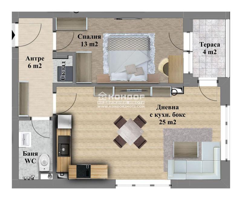 Оферта 59606: ТОП ОФЕРТА ! Представяме Ви новоизграждаща се сграда в един от най-зелените и спокойни райони в град Пловдив в близост до големи хипермаркети, паркове, училища. Разпределение на жилището: ъглова дневна с трапезария и кухненски бокс-25кв.м. с излаз на обща тераса, една самостоятелна спалня 13кв.м., баня с тоалетна, широко входно антре и склад. Сградата е с ниско застрояване с модерна архитектура, като разполага с външни паркоместа и подземни гаражи. Предлагаме различни варианти за разсрочено плащане, обвързано с етапите на строителството. Приложените 3D изображения са примерни!