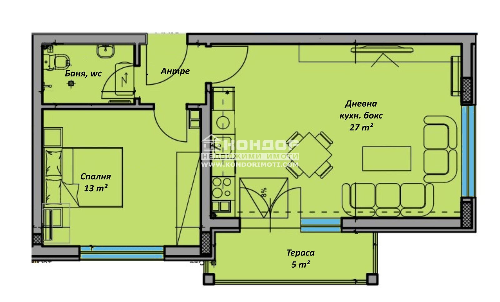 Разпределение: Апартаментът се състои от просторна югозападна дневна 27кв.м. с трапезария + кухненски бокс, голяма самостоятелна спалня 13кв.м., баня с тоалетна, входно антре и една тераса.