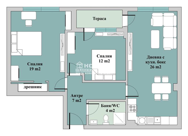 Разпределения - Тристаен апартамент, състоящ се от дневна с трапезария и кухненски бокс - 26 м2, детска спалня - 12 м2, тераса - обща за двете стаи, родителска спалня - 19 м2 с обособена гардеробна, баня с тоалетна и функционално входно антре.