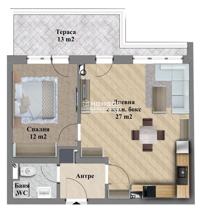 Оферта 59584: ТОП ОФЕРТА ! Представяме Ви новоизграждаща се сграда в един от най-зелените и спокойни райони в град Пловдив в близост до големи хипермаркети, паркове, училища. Разпределение на жилището: дневна с трапезария и кухненски бокс-27кв.м., една спалня - 12кв.м., баня с тоалетна, входно антре, килер и една обща тераса. Сградата е с ниско застрояване с модерна архитектура, като разполага с външни паркоместа и подземни гаражи. Предлагаме различни варианти за разсрочено плащане, обвързано с етапите на строителството. Приложените 3D изображения са примерни!