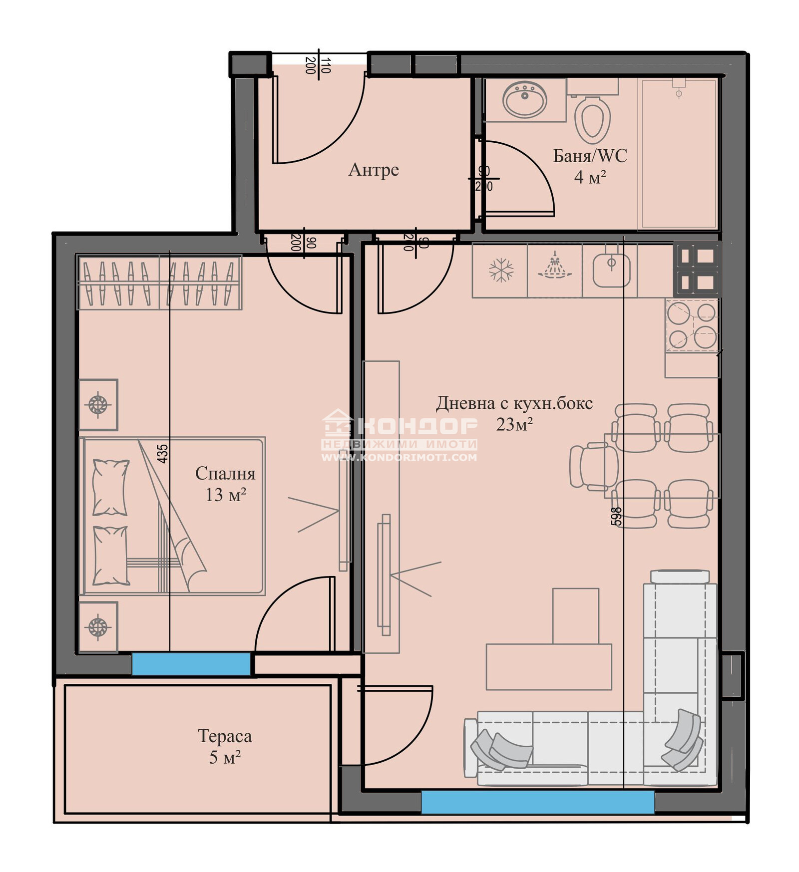 Оферта 63490: Имаме Удоволствието да ви Предложим Функционален Двустаен Апартамент с Югозападно изложение в луксозна сграда, отличаваща се с модерна и съвременна архитектура в един отлично развиващ се район за живеене райони с отлична локация в близост до Училища, детски градини, удобен транспорт към централна градска част и големи хипермаркети. Проектът е с нисък процент общи части, което дава възможност на клиентите да получат повече реална площ !!! Жилището се състои от просторна и слънчева дневна 23кв.м. с трапезария и кухненски бокс, една самостоятелна спалня 13кв.м., баня с WC, входно антре и една тераса, обща и за двете стаи. Сградата се изпълнява от реномирана Строителна Компания, която разполага с множество готови обекти, утвърдила се като една от водещите и Коректни Фирми в Града. Апартаментите ще бъдат завършени според всички изисквания за съвременно строителство - блиндирана врата, 6-камерна дограма, МДФ-вътрешни врати. Луксозни общи части, хидро и топло изолация, хидравличен асансьор, гранитено стълбище, алуминиев парапет. Свободни Подземни Гаражи и външни Паркоместа . Сградата се намира на Отлично и предпочитано място като локация - ОТЛИЧНА ИНВЕСТИЦИЯ !!! Възможност за изплащане на разсрочено плащане в рамките на строителството.ВИЖТЕ ОЩЕ ИЗГОДНИ ОФЕРТИ НА https://www.kondorimoti.com/ С ЕЖЕДНЕВНА АКТУАЛИЗАЦИЯ!