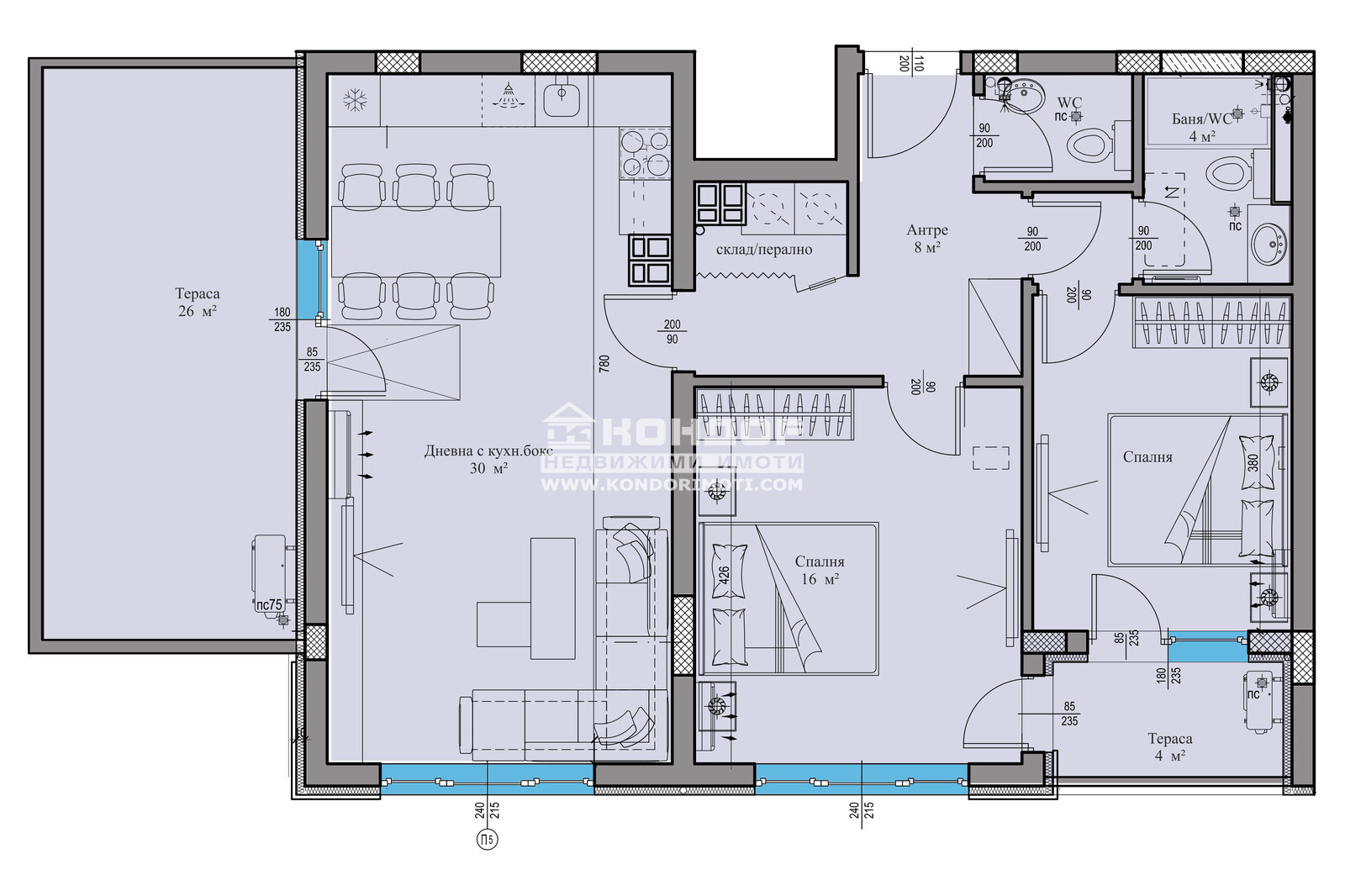 Оферта 63594: Имаме Удоволствието да ви Предложим Функционален тристаен апартамент в луксозна сграда, отличаваща се с модерна и съвременна архитектура в един отлично развиващ се район за живеене райони с отлична локация в близост до Училища, детски градини, удобен транспорт към централна градска част и големи хипермаркети. Проектът е с нисък процент общи части, което дава възможност на клиентите да получат повече реална площ !!! Жилището се състои от светла, ъглова дневна 30кв.м. с трапезария и кухненски бокс, две самостоятелни спални, баня с WC, втора тоалетна, входно антре, перално помещение и две тераси. Сградата се изпълнява от реномирана Строителна Компания, която разполага с множество готови обекти, утвърдила се като една от водещите и Коректни Фирми в Града. Апартаментите ще бъдат завършени според всички изисквания за съвременно строителство - блиндирана врата, 6-камерна дограма, МДФ-вътрешни врати. Луксозни общи части, хидро и топло изолация, хидравличен асансьор, гранитено стълбище, алуминиев парапет. Свободни Подземни Гаражи и външни Паркоместа . Сградата се намира на Отлично и предпочитано място като локация - ОТЛИЧНА ИНВЕСТИЦИЯ !!! Възможност за изплащане на разсрочено плащане в рамките на строителството.ВИЖТЕ ОЩЕ ИЗГОДНИ ОФЕРТИ НА https://www.kondorimoti.com/ С ЕЖЕДНЕВНА АКТУАЛИЗАЦИЯ!