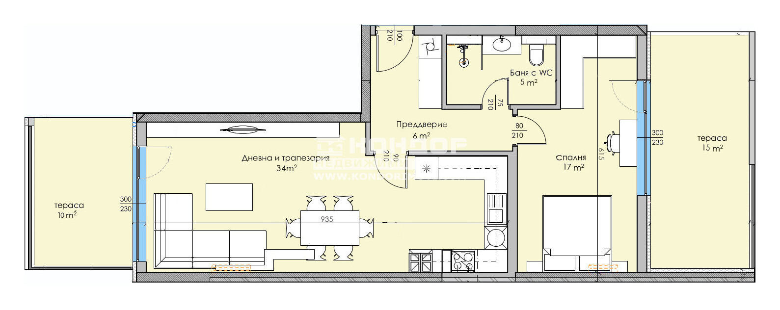 Оферта 62851: Предлагаме Ви възможността да закупите просторен 2-стаен апартамент в луксозна жилищна сграда с модерна визия, проектиран да създаде максимален комфорт на живущите в него. Основната концепция e премиум строителство, отличаващо се със съвременен архитектурен дизайн и европейска визия. Едно от основните му предимства е страхотната локация, разположен на пешеходна близост до Централна градска част, съчетаващо лукс спокойствие и комфорт. Жилището се състои от дневна - 34кв.м. с трапезария и кухненски бокс, голяма самостоятелна спалня 17 кв.м., баня с тоалетна, коридор с място за перално и две панорамни тераси. Към апартамента има прилежаща изба. Основната концепция при проектирането е да се постигнат просторни и функционални стаи с цел да се създаде максимален уют на модерното семейство. Изключителна съвременна архитектура и модерна технология на строителство. Визията е иновативна, привличаща внимание с уникалността си. Безопасна и сигурна среда за пребиваващите допълват комфорта на сградата. Всяко жилище разполага с пълно окабеляване за домофон, интернет и кабелна телевизия, общите части са луксозно завършени, а апартаментите са с алуминиева дограма с троен стъклопакет от най-висок клас, както и масивна блиндирана входна врата. За удобство на живущите съществува възможността да закупят подземни и надземни паркоместа. Възможност за закупуване чрез Банков Кредит на изключително изгодни условия за клиенти на Агенцията!