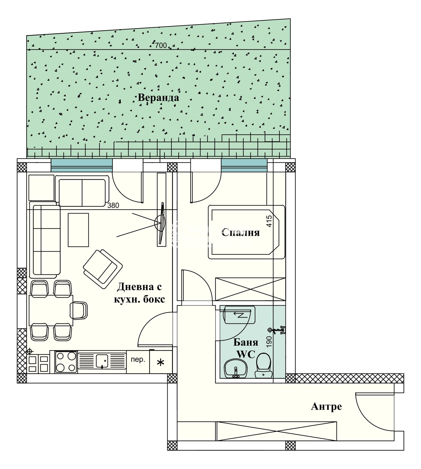 Оферта 59513: Сега имате възможността да си закупите функционален 2-стаен апартамент в малка новоизградена луксозна сграда, проектирана така, че да създаде максимален комфорт и уют със изключително нисък процент общи части - 12.00 %. Сградата се намира в един от най-бързо развиващите се райони с нискоетажно застрояване на тихо и спокойно място в близост до всички необходими комуникации. Жилището се състои от дневна с трапезария и кухненски бокс, една самостоятелна спалня, баня с тоалетна, входно антре, килер и дворна веранда. Обектът е построен от фирма с доказан опит и луксозно изпълнение на своите сгради, което е осъществено с висококачествени материали и съвременни технологии, по европейски стандарти, шесткамерна PVC дограма, червена Австрийска Тухла, масивна Блиндирана входна врата с 4-странно заключване, сензорно осветление, хидравлични асансьори с огледална кабина. Свободни Паркоместа в двора на цени от 8000 евро!!! Възможност за закупуване чрез Банков Кредит или на разсрочено плащане в рамките на строителството !!! ЧУДЕСНА ИНВЕСТИЦИЯ!!! Приложените 3D изображения са примерни!!! Възползвайте се от възможността да живеете в малка бутикова сграда!!!