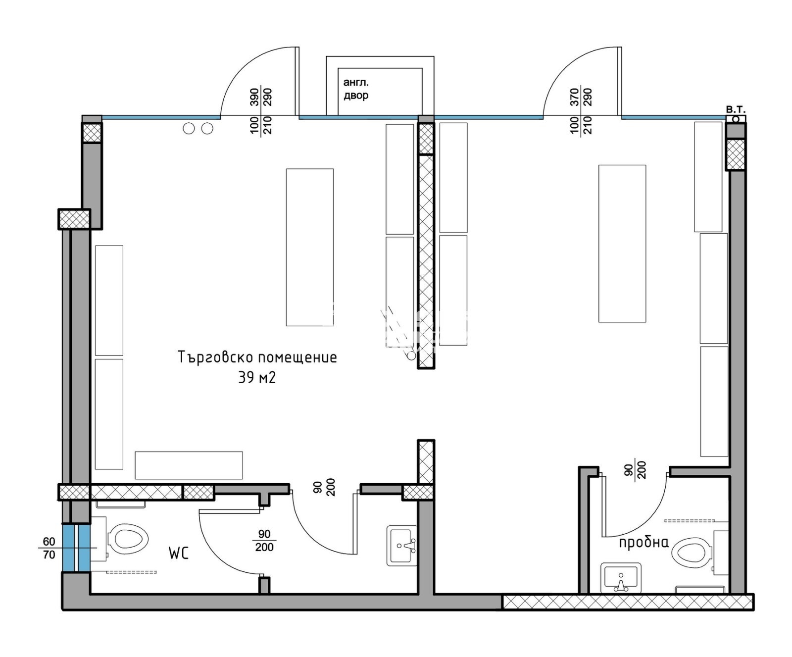 Разпределения - Предлагаме на Вашето внимание магазин с голяма витрина към оживена улица с едно две търговски помещения, санитарен възел и склад/пробна.