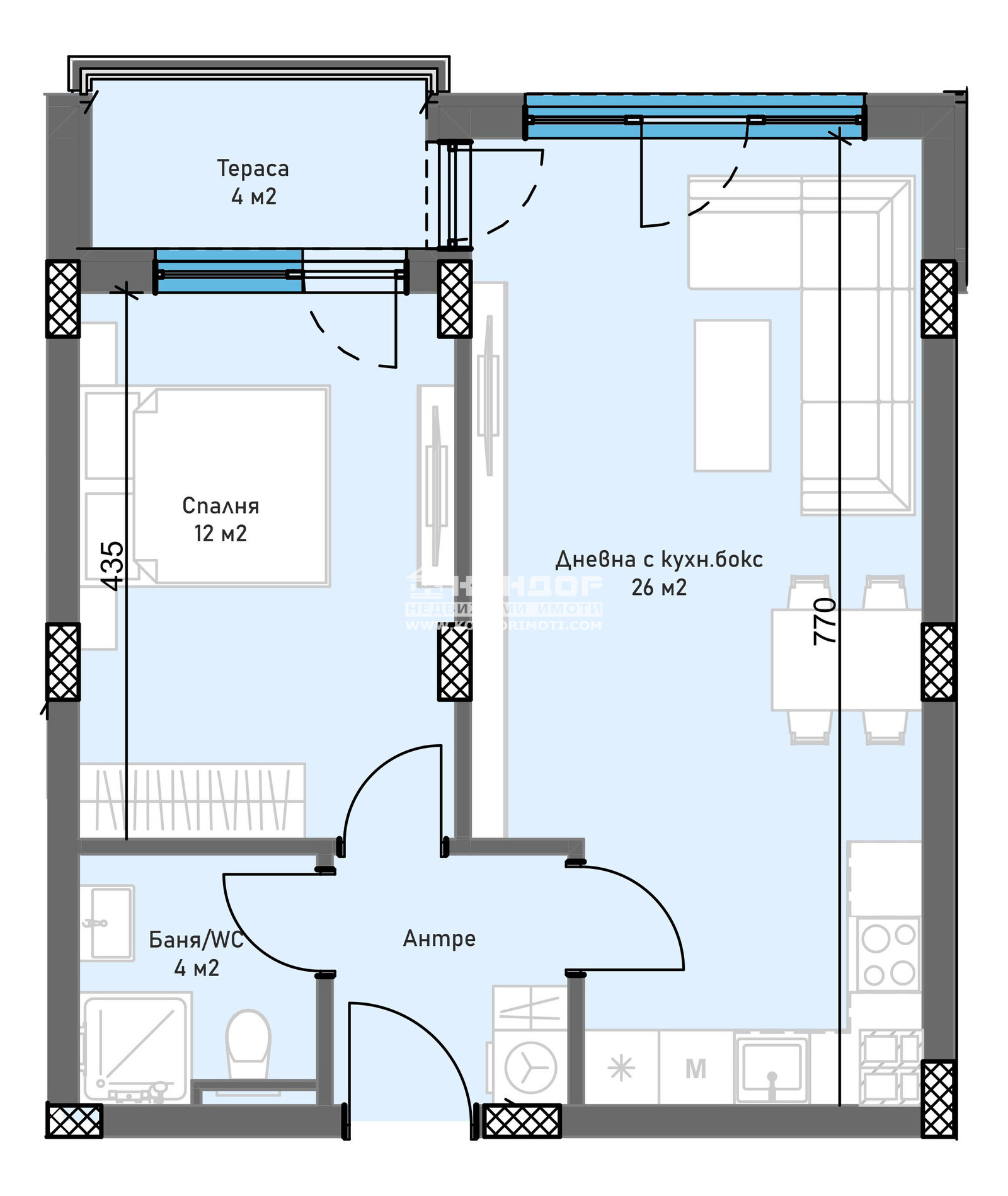 Оферта 64443: Предлагаме Ви възможността да закупите 2 - стаен апартамент в новоизграждащ се луксозен жилищен комплекс с модерна визия, проектиран да създаде максимален комфорт на живущите в него. Функционално разположени жилищни секции с елегантен силует готов да предложи комфорт и модерен начин на живот. Едно от основните му предимства е страхотната локация, отлична комуникативност и динамична пътна инфраструктура, която осигурява бърз и лесен достъп до комплекса от всяка точка на града. Той съчетава лукс, спокойствие и комфорт с подсигурени паркоместа и гаражи. Жилището се състои от просторна дневна/26 кв.м./ с кухненска част и трапезария, една самостоятелна спалня 13кв.м., баня с тоалетна, входно антре с място за перално и една тераса обща за двете стаи. Към апартамента има избено помещение, включено в цената! Основната концепция при проектирането е да се постигнат просторни и функционални стаи, с цел да се създаде максимален уют на модерното семейство. Изключителна съвременна архитектура и модерна технология на строителство. Визията е иновативна, привличаща внимание с уникалността си. Всяко жилище ще разполага с пълно окабеляване за домофон, интернет и кабелна телевизия, общите части са луксозно завършени, жилищата са с алуминиева дограма с троен стъклопакет от най-висок клас, масивна блиндирана входна врата. За удобство на живущите съществува възможността да закупят подземни паркоместа и гаражи с топла връзка към комплекса. Гъвкави схеми на разсрочено плащане спрямо възможностите на клиента в рамките на строителството или закупуване чрез Банков Кредит, на изключително изгодни условия за клиенти на агенцията !!! Приложените изображения са от завършени проекти на строителната фирма.