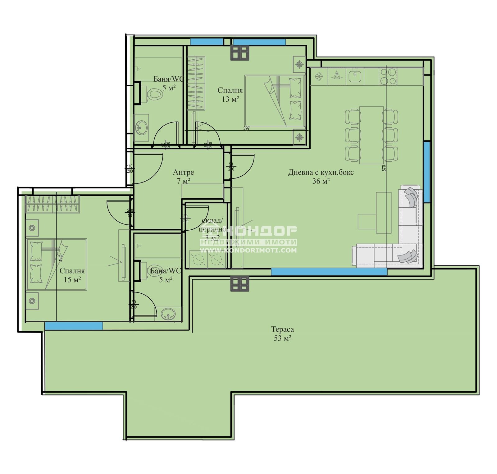 Оферта 63511: Имаме Удоволствието да ви Предложим просторен и функционален Тристаен Апартамент в луксозна сграда, отличаваща се с модерна и съвременна архитектура в един отлично развиващ се район за живеене райони с отлична локация в близост до Училища, детски градини, удобен транспорт към централна градска част и големи хипермаркети. Проектът е с нисък процент общи части, което дава възможност на клиентите да получат повече реална площ !!! Жилището се състои от просторна слънчева дневна с трапезария и светъл кухненски бокс /36 кв.м./, две големи и непреходни спални: родителска 15кв.м. със собствена баня, детска 13кв.м., втора голяма баня с тоалетна 5кв.м., широко входно антре с място за гардероб, самостоятелен килер с опция за перално помещение и две чудесни панорамни тераси, едната с възможност за изграждане на барбекю и място за отдих и релакс зона. Сградата се изпълнява от реномирана Строителна Компания, която разполага с множество готови обекти, утвърдила се като една от водещите и Коректни Фирми в Града. Апартаментите ще бъдат завършени според всички изисквания за съвременно строителство - блиндирана врата, 6-камерна дограма, МДФ-вътрешни врати. Луксозни общи части, хидро и топло изолация, хидравличен асансьор, гранитено стълбище, алуминиев парапет. Свободни Подземни Гаражи и външни Паркоместа . Сградата се намира на приятно и спокойно място в близост до училища, детска градина и удобен транспорт - ОТЛИЧНА ИНВЕСТИЦИЯ !!! Възможност за изплащане на разсрочено плащане в рамките на строителството !!!ВИЖТЕ ОЩЕ ИЗГОДНИ ОФЕРТИ НА https://www.kondorimoti.com/ С ЕЖЕДНЕВНА АКТУАЛИЗАЦИЯ!