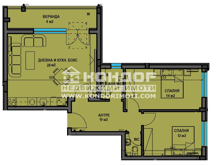 Оферта 61567: Представяме Ви новоизградена малка и луксозна сграда от типа на Фамилна къща, проектирана така, че да създаде максимален комфорт и уют. Сградата се намира на тихо и спокойно място в близост до всички необходими комуникации. Жилището се състои от просторна дневна с трапезария и кухненски бокс 28кв.м. с излаз на веранда 4кв.м., две самостоятелни спални: родителска 14кв.м. и детска 12кв.м., баня с тоалетна, втори санитарен възел и широко входно антре. Към апартамента се закупува складово помещение на етажа на цена от 1200 евро/бр. Обектът е построен от фирма с доказан опит, като разполагаме с готови сгради и можем да Ви покажем качеството на изпълнение, което се осъществява с висококачествени материали и съвременни технологии, по европейски стандарт, петкамерна PVC дограма, червена Австрийска Тухла, масивна Блиндирана входна врата с 4-странно заключване, сензорно осветление, хидравлични асансьори с огледална кабина. Свободни подземни Гаражи и паркоместа в двора!!! Възможност за Закупуване чрез Банков Кредит!!!Възползвайте се от възможността да живеете в малка бутикова сграда!!!