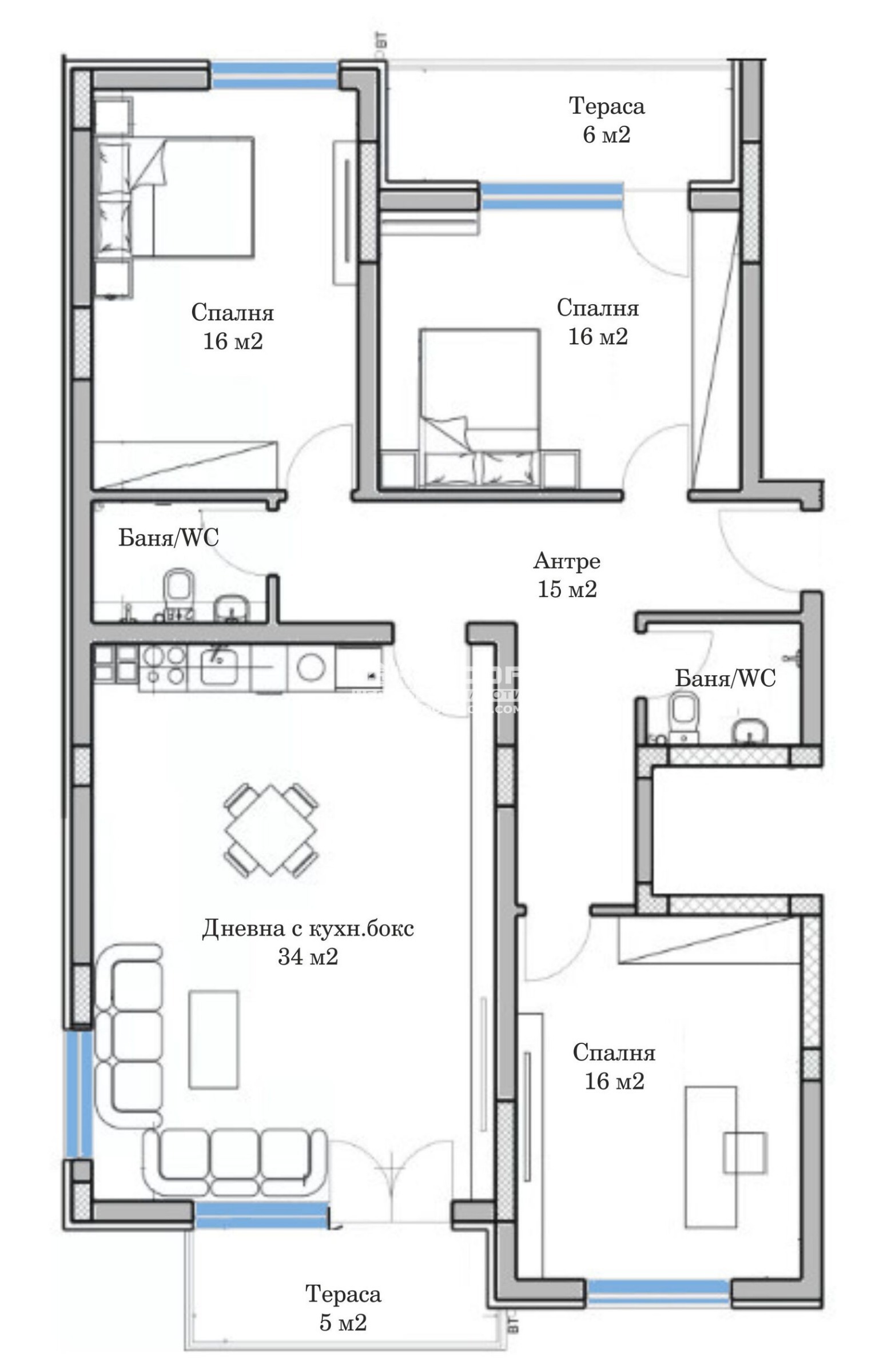 Оферта 64938: ЛУКСОЗНА БУТИКОВА СГРАДА от висок клас в близост до идеалния център на града, в един от най-предпочитаните квартали, множество удобства и разбира се бърз достъп до Центъра. Тристаен апартамент, състои се от просторна дневна с трапезария + кухненски бокс 26кв.м. и излза на веранда, две непреходни спални: детска 16кв.м. и родителска 17кв.м., баня с тоалетна, перално помещение, входно антре с място за гардероб и една веранда с излаз от двете спални. Апартаментите се издават изцяло на замазка и шпакловка, с поставени входни блиндирани врати !!! Основното предимство на жилищната сграда е изчистена стилна архитектура, нейната локация и лимитираният брой апартаменти! В строителството са заложени строителни технологии от най-висок клас. Кооперация с изключително луксозни общи части проектирана в модерен стил. Около сградата има разнообразие от хранителни магазини, заведения, ресторанти и парк. Отлично изградена инфраструктура и лесен пешеходен достъп до ключови места. Възможност за закупуване на подземни и надземни паркоместа и гаражи !!!ВИЖТЕ ОЩЕ ИЗГОДНИ ОФЕРТИ НА https://www.kondorimoti.com/ С ЕЖЕДНЕВНА АКТУАЛИЗАЦИЯ!