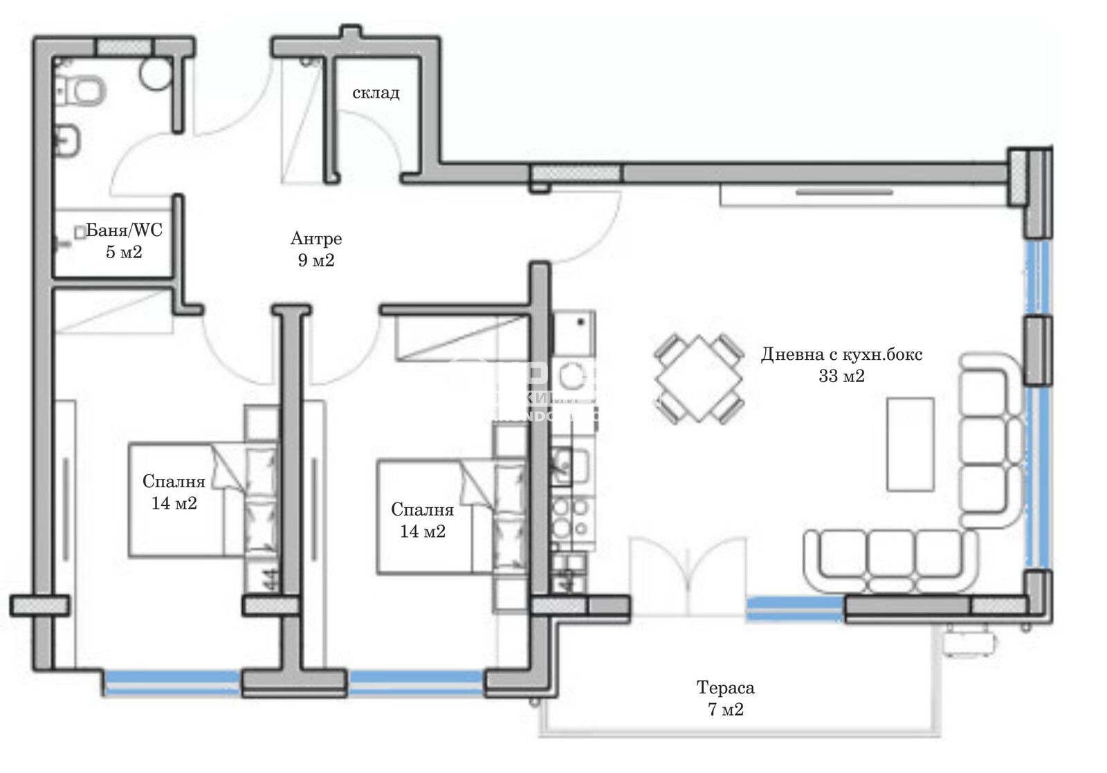 Оферта 64950: ЛУКСОЗНА БУТИКОВА СГРАДА от затворен тип комплекс С НИСЪК % ОБЩИ ЧАСТИ, в близост до идеалния център на града, в един от най-предпочитаните квартали, множество удобства и разбира се бърз достъп до Центъра. Жилището се състои от ЮГОЗАПАДНА дневна с трапезария и кухненски бокс 33 кв.м., две самостоятелни спални по 14кв.м., баня с тоалетна, килер, входно антре с място за гардероб и една тераса. Апартаментите се издават изцяло на замазка и шпакловка, с поставени входни блиндирани врати !!! Основното предимство на жилищната сграда е изчистена стилна архитектура, нейната локация и лимитираният брой апартаменти! В строителството са заложени строителни технологии от най-висок клас. Кооперация с изключително луксозни общи части проектирана в модерен стил. Около сградата има разнообразие от хранителни магазини, заведения, ресторанти и парк. Отлично изградена инфраструктура и лесен пешеходен достъп до ключови места. Възможност за закупуване на подземни и надземни паркоместа и гаражи !!! ВИЖТЕ ОЩЕ ИЗГОДНИ ОФЕРТИ НА https://www.kondorimoti.com/ С ЕЖЕДНЕВНА АКТУАЛИЗАЦИЯ!