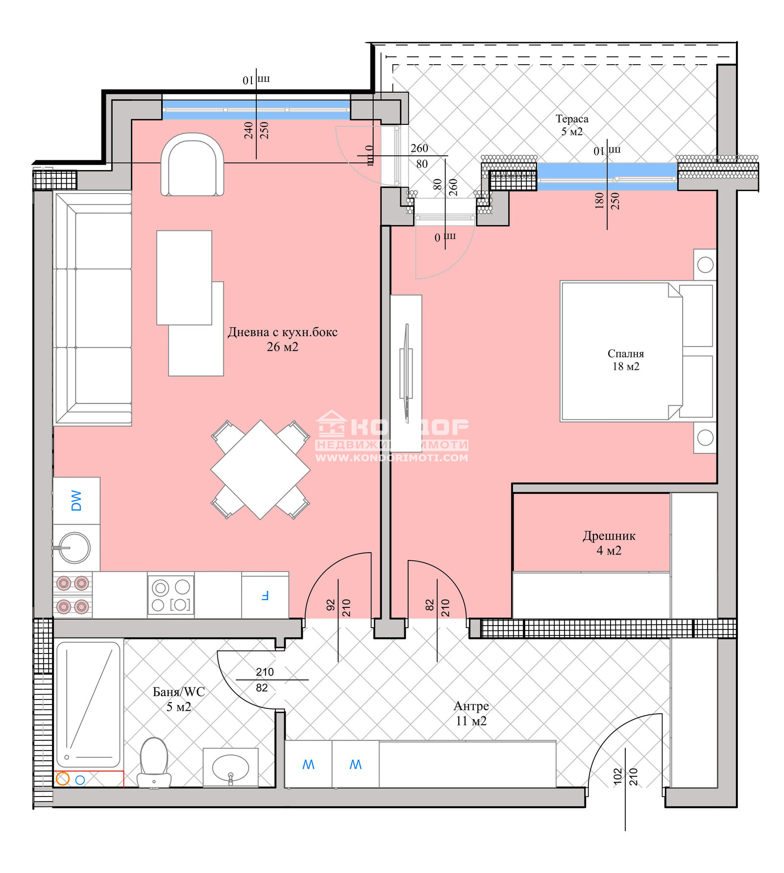 Разпределение: просторен двустаен апартамент състои се от широко входно антре с място гардероб, слънчева дневна 26кв.м. с кухненски бокс, голяма самостоятелна спалня 18кв.м. с дрешник/склад, баня с тоалетна и една тераса.