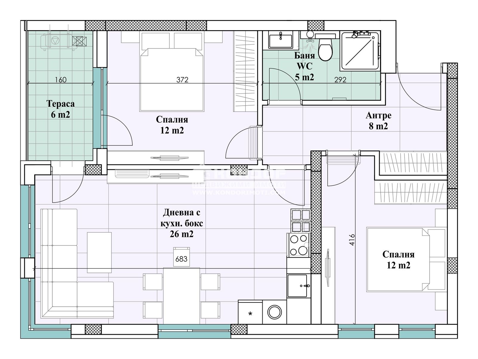 Апартаментът който Ви предлагаме се състои от просторна дневна с кухненски бокс 26 кв.м., две самостоятелни спални, баня с тоалетна, антре и тераса.
