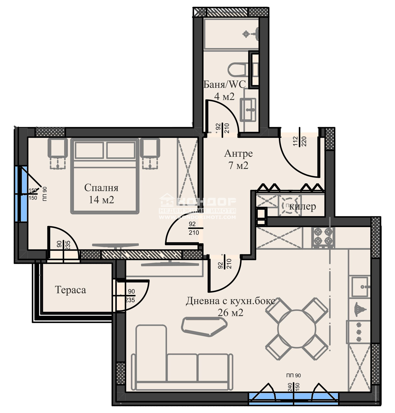Разпределения - Предлагаме на Вашето внимание просторен двустаен апартамент, състоящ се от ъглова дневна с трапезария и кухненски бокс - 26 м2, родителска спалня 14м2, една тераса - обща за двете стаи, баня с тоалетна, входно антре и килер/перално.