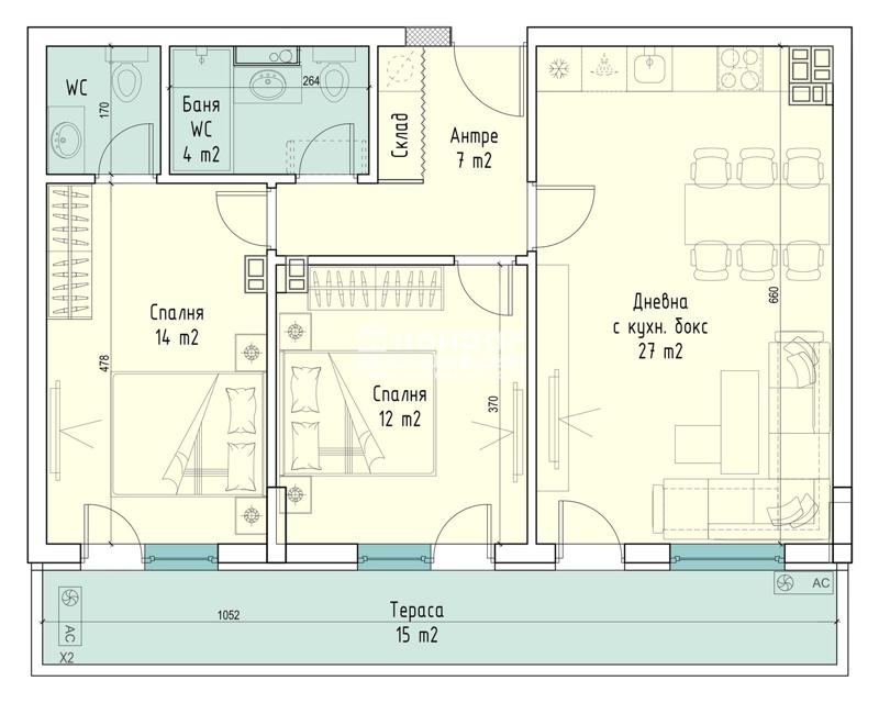Оферта 59329: Предлагаме Ви възможността да си закупите жилище в един от най-иновативните и модерни комплекси, проектирани през последните години. Перфектното съчетание между цена, качество и локация, Луксозни екстри, задоволяващи всеки един каприз. Апартаментът е с ИЗЦЯЛО ЮЖНО изложение и се състои от просторна дневна -31кв.м. с трапезария и кухненски бокс, две самостоятелни спални: родителска 15кв.м. със самостоятелна баня, детска 12кв.м., втора баня с тоалетна, широко входно антре с място за перално помещение и една тераса обща за всички стаи. Високотехнологично строителство, като е заложено на водещи и наложени марки на пазара относно материалите, които ще бъдат използвани. Тухли - Wienerberger, система за покрив Ondulin, допълнителна висококачествена шумоизолация - Baumit, даваща Ви тишина и спокойствие, многокамерна дограма - Etem с троен стъклопакет 4-сезона с монтирани външни ел. щори за Вашият комфорт и лично пространство. Чиста, светла височина от 2.80м., даваща простор и обем на Вашите жилища. Умни камери с лицево разпознаване, както и 24/7 подсигурена жива охрана, ще се грижат за Вашето спокойствие. Проектиран е просторен вътрешен двор с озеленена площ , места за отдих между жилищните секции с пейки, детски и кучешки площадки, както и открито пространство за спорт. Осигурено е 100% надземно и подземно паркиране. Комплексът е свързан с голям възлов булевард и е на метри от големи търговски вериги и молове, ресторанти и развлекателни заведения. Приложените изображения са от готова сграда на строителната компания и са с илюстративна цел! Предлагаме преференциално банково кредитиране с изключително изгодни условия за клиенти на Агенция КОНДОР !ВИЖТЕ ОЩЕ ИЗГОДНИ ОФЕРТИ НА https://www.kondorimoti.com/ С ЕЖЕДНЕВНА АКТУАЛИЗАЦИЯ!
