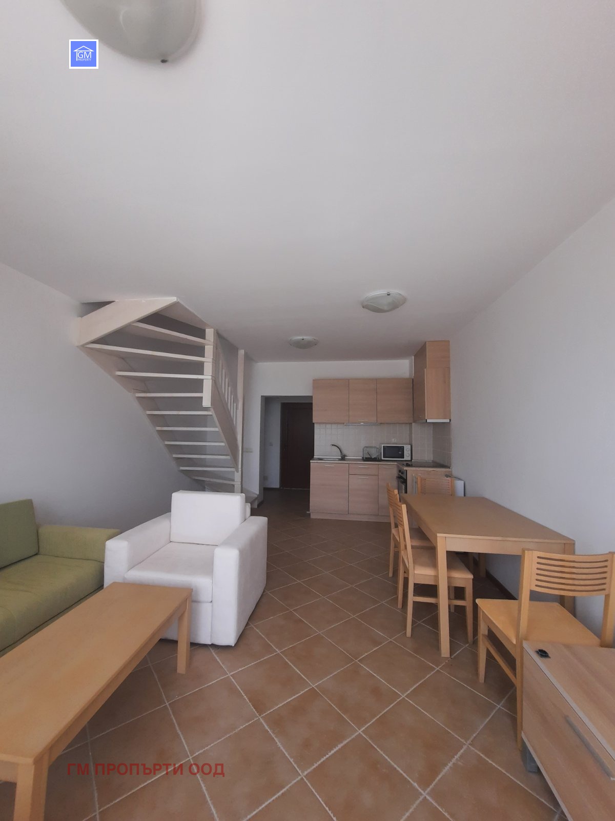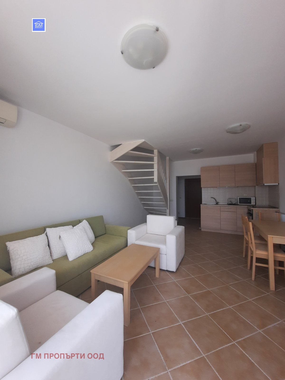 GM Property Предлага ексклузивно! Къща на три нива с площ 115 кв.м във ваканционен комплекс с голям открит басейн и другите удобства, ресторант, кафене, занималня за деца в летен период. Имотът е със следното разпределение: Първо ниво: входен коридор, голям дневен тракт - трапезария с открита кухненска част,веранда, стълбище, килер/дрешник, комбиниран санитарен възел. По вътрешни стълби се стига до второ ниво: две спални, стълбище, баня с тоалетна.