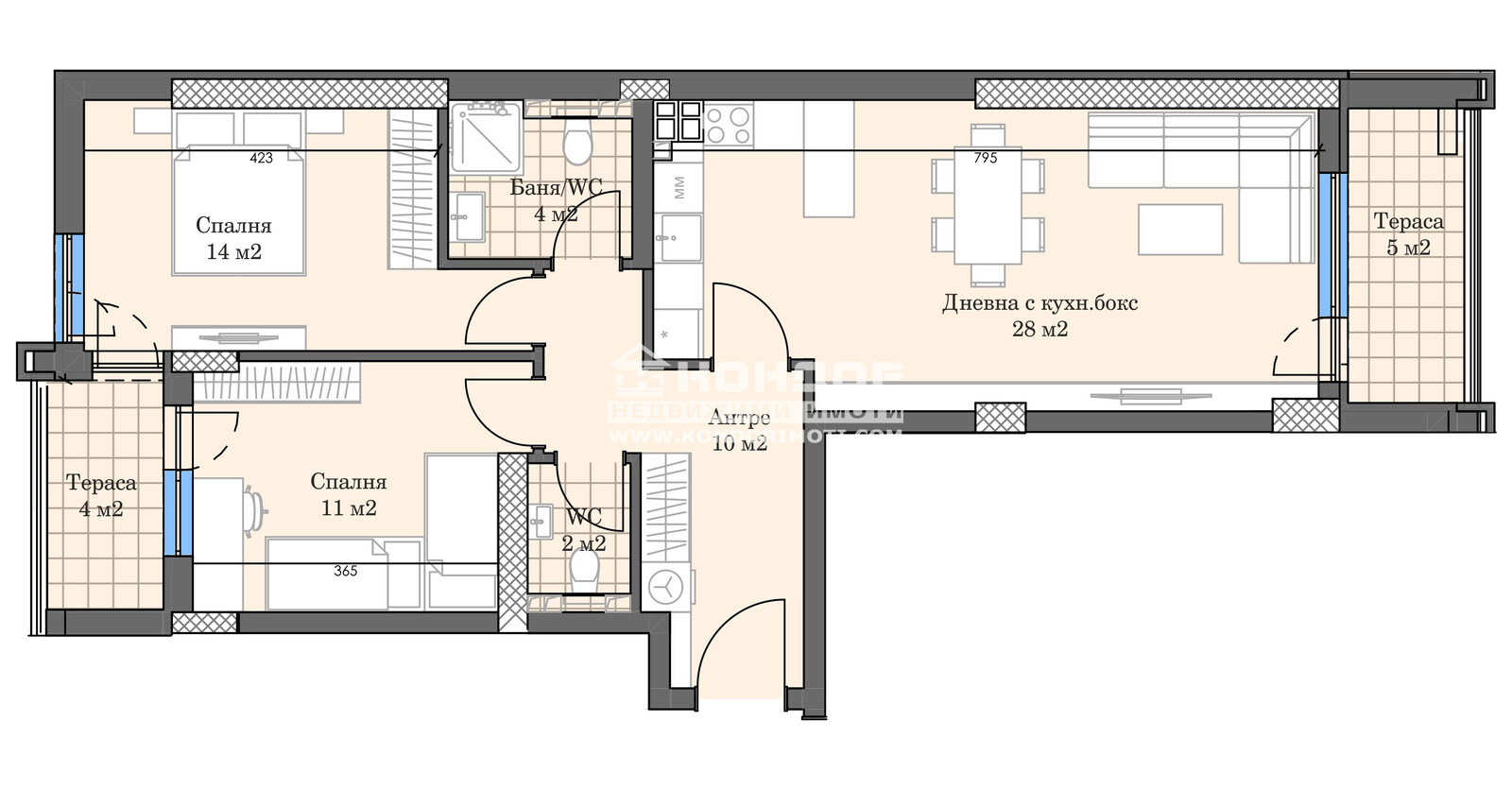 Оферта 66462: Предлагаме Ви възможността да закупите тристаен апартамент в новоизграждащ се луксозен жилищен комплекс с модерна визия, проектиран да създаде максимален комфорт на живущите в него. Tри хоризонтално разположени жилищни секции с елегантен силует готов да предложи комфорт и модерен начин на живот. Едно от основните му предимства е добрата локация, отлична комуникативност и динамична пътна инфраструктура, която осигурява бърз и лесен достъп до комплекса, от всяка точка на града. Той съчетава лукс, спокойствие и комфорт, с подсигурени паркоместа и гаражи. Жилището се състои от дневна 28 кв.м. с кухненска част и трапезария, две самостоятелни спални, баня с тоалетна, втори санитарен възел, входно антре с място за гардероб и перално и две тераси. Основната концепция при проектирането е да се постигнат просторни и функционални стаи, с цел да се създаде максимален уют на модерното семейство. Изключителна съвременна архитектура и модерна технология на строителство. Визията е иновативна, привличаща внимание с уникалността си. Всяко жилище ще разполага с пълно окабеляване за домофон, интернет и кабелна телевизия, общите части са луксозно завършени, жилищата са с алуминиева дограма с троен стъклопакет от най-висок клас, масивна блиндирана входна врата. За удобство на живущите съществува възможността да закупят подземни паркоместа и гаражи с топла връзка към комплекса. Гъвкави схеми на разсрочено плащане спрямо възможностите на клиента в рамките на строителството или закупуване чрез Банков Кредит, на изключително изгодни условия за клиенти на агенцията!!! Приложените изображения са от завършени проекти на строителната фирма.ВИЖТЕ ОЩЕ ИЗГОДНИ ОФЕРТИ НА https://www.kondorimoti.com/ С ЕЖЕДНЕВНА АКТУАЛИЗАЦИЯ!
