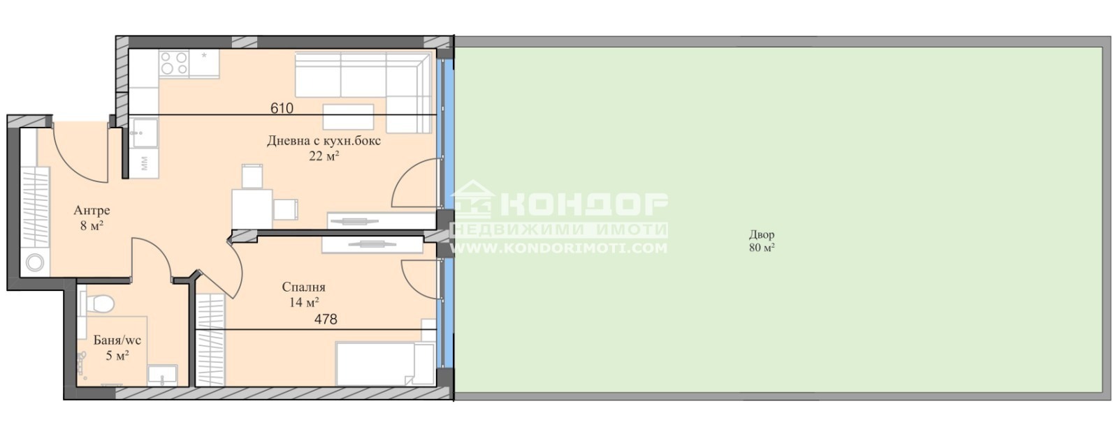 Разпределения - Просторни и много функционални апартаменти с просторни стаи и гледка към Стара планина, а също и с партерни жилища с двор и такива с големи панорамни тераси. Апартаментът, който Ви предлагаме е с ИЗЦЯЛО ИЗТОЧНО ИЗЛОЖЕНИЕ и се състои от дневна с кухненски бокс 22кв.м., самостоятелна спалня 14кв.м., баня с тоалетна 5кв.м., входно антре с място за гардероб и перално и собствен двор от 80кв.м.