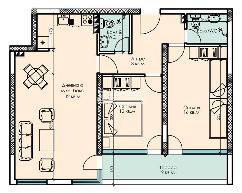 Разпределения - Предлагаме на Вашето внимание функционален тристаен апартамент, състоящ се от просторна дневна - 32кв.м. с трапезария и кухненски бокс, две самостоятелни спални: родителска - 16кв.м. и детска - 12кв.м., две бани с тоалетна, широко входно антре и една тераса, обща за трите стаи.
