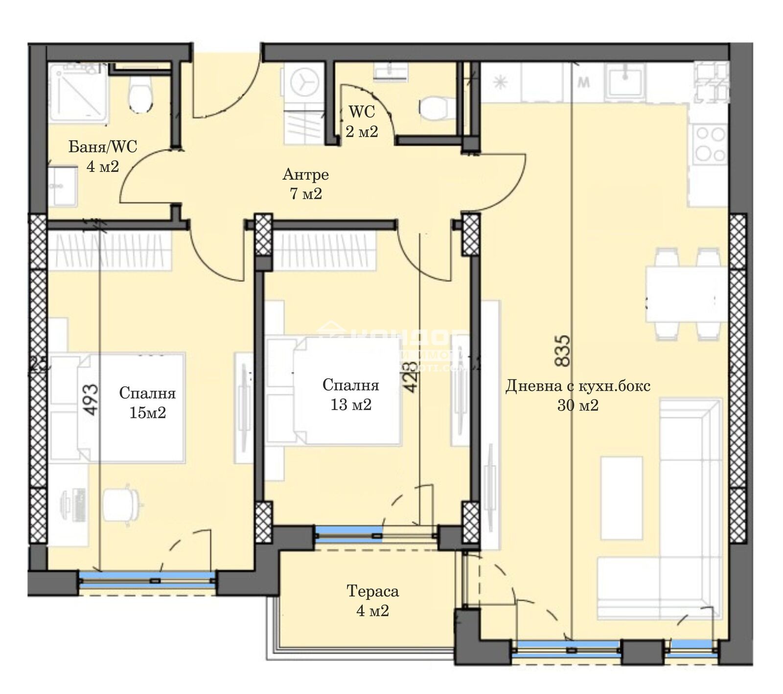 Оферта 65913: Предлагаме Ви възможността да закупите тристаен апартамент с изцяло южно изложение в новоизграждащ се луксозен жилищен комплекс с модерна визия, проектиран да създаде максимален комфорт на живущите в него. Функционално разположени жилищни секции с елегантен силует готов да предложи комфорт и модерен начин на живот. Едно от основните му предимства е страхотната локация, отлична комуникативност и динамична пътна инфраструктура, която осигурява бърз и лесен достъп до комплекса от всяка точка на града. Той съчетава лукс, спокойствие и комфорт с подсигурени паркоместа и гаражи. Жилището се състои от просторна дневна /30 кв.м./ с кухненска част и трапезария, две самостоятелни спални 13 и 15 кв.м., баня с тоалетна, втора тоалетна, входно антре с място за перално и една тераса. Основната концепция при проектирането е да се постигнат просторни и функционални стаи, с цел да се създаде максимален уют на модерното семейство. Изключителна съвременна архитектура и модерна технология на строителство. Визията е иновативна, привличаща внимание с уникалността си. Всяко жилище ще разполага с пълно окабеляване за домофон, интернет и кабелна телевизия, общите части са луксозно завършени, жилищата са с алуминиева дограма с троен стъклопакет от най-висок клас, масивна блиндирана входна врата. За удобство на живущите съществува възможността да закупят подземни паркоместа и гаражи с топла връзка към комплекса. Гъвкави схеми на разсрочено плащане спрямо възможностите на клиента в рамките на строителството или закупуване чрез Банков Кредит, на изключително изгодни условия за клиенти на агенцията !!!