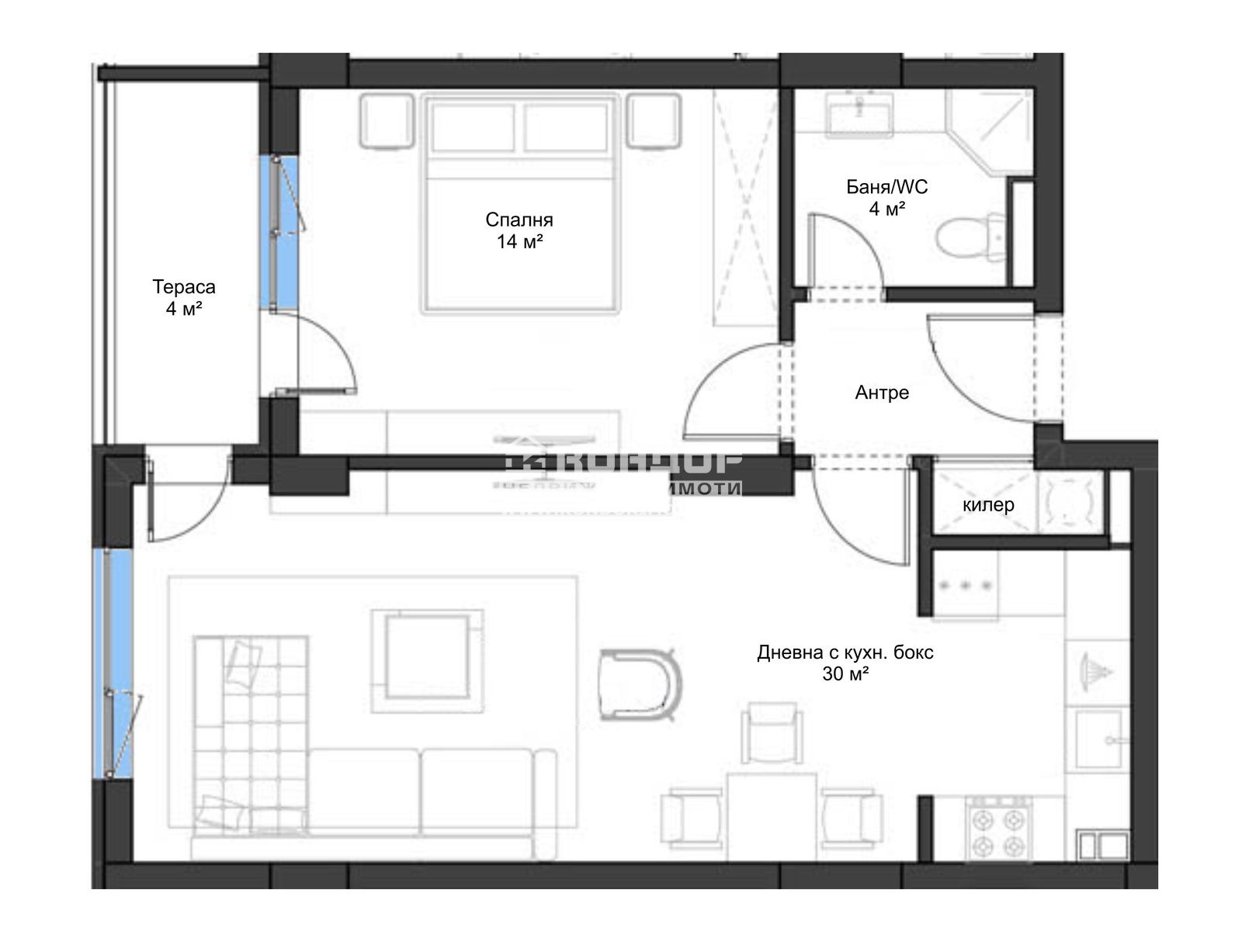 Оферта 61991: Нова луксозна сграда, намираща се на чудесно място в близост до централната част на квартала, съчетаваща в себе си модерната архитектура с високо качество на строителство и усещането за уют и спокойствие. Намира се в най-атрактивния и предпочитан за живеене и инвестиция квартал на Пловдив Кючук Париж, с отлична локация, в близост до училища, детски градини и всички необходими комуникации за нуждите на модерния човек. Жилището, което ви предлагаме се състои от дневна 30кв.м. с трапезария и кухненски бокс, една голяма самостоятелна спалня 14кв.м., баня с тоалетна, склад, входно антре и една тераса обща за двете стаи. Към апартамента има прилежаща изба включена в цената. Степен на завършеност: стени и тавани - шпакловка, под - циментова замазка, балкони - гранитогрес, мокри помещения-замазка и мазилка,