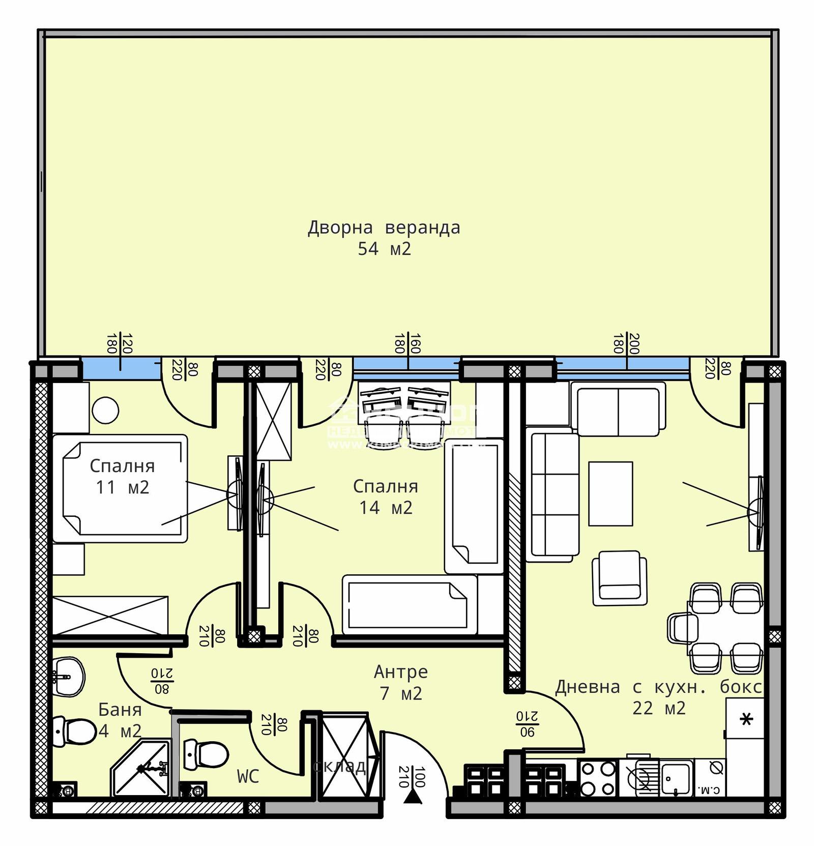 БЕЗ КОМИСИОН ОТ КУПУВАЧА!!! Предлагаме Ви възможността да си закупите тристаен апартамент с ИЗЦЯЛО ЮЖНО изложение в нискоетажана жилищна сграда намираща се на тихо и спокойно място в близост до всички необходими комуникации, училища, детски градини, удобен транспорт и големи хранителни хипермаркети. Сградата е проектирана проектирана с изключително нисък процент общи части - 10%, което дава повече реална и използваема площ на стаите и създава максимален комфорт на своите ползватели. Жилището се състои от дневна с кухненски бокс - 22кв.м., две самостоятелни спални, баня с тоалетна, втора тоалетна, перално, широко входно антре и една дворна веранда от 54кв.м. с достъп от всички стаи. Перспективна ИНВЕСТИЦИЯ ЗА ОТДАВАНЕ ПОД НАЕМ!!! Изпълнението се осъществява с висококачествени материали и съвременни технологии, по европейски стандарт, шест камерна PVC дограма, блиндирана входна врата с 4-странно заключване, сензорно осветление, хидравлични асансьори с огледална кабина. Свободни Паркоместа на цени от 8000 евро и партерни Гаражи !!! Приложените снимки са от друга готова сграда на строителната фирма. Възможност за закупуване на разсрочено плащане в рамките на строителството или чрез Банков Кредит на изключително изгодни условия, договорени за клиенти на Агенция КОНДОР !!!
