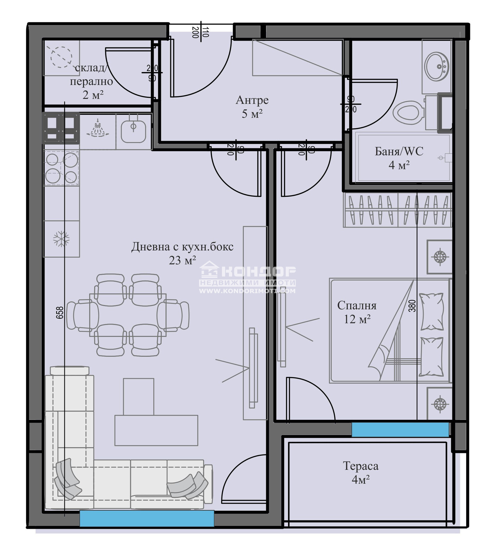 Оферта 63581: Имаме Удоволствието да ви Предложим Функционален Двустаен Апартамент с Югозападно изложение в луксозна сграда, отличаваща се с модерна и съвременна архитектура в един отлично развиващ се район за живеене райони с отлична локация в близост до Училища, детски градини, удобен транспорт към централна градска част и големи хипермаркети. Проектът е с нисък процент общи части, което дава възможност на клиентите да получат повече реална площ !!! Жилището се състои от просторна и слънчева дневна с трапезария и кухненски бокс, една самостоятелна спалня, баня с WC, широко входно антре с място за гардероб, самостоятелен Килер с опция за перално помещение и една тераса, обща и за двете стаи. Сградата се изпълнява от реномирана Строителна Компания, която разполага с множество готови обекти, утвърдила се като една от водещите и Коректни Фирми в Града. Апартаментите ще бъдат завършени според всички изисквания за съвременно строителство - блиндирана врата, 6-камерна дограма, МДФ-вътрешни врати. Луксозни общи части, хидро и топло изолация, хидравличен асансьор, гранитено стълбище, алуминиев парапет. Свободни Подземни Гаражи и външни Паркоместа . Сградата се намира на Отлично и предпочитано място като локация - ОТЛИЧНА ИНВЕСТИЦИЯ !!! Възможност за изплащане на разсрочено плащане в рамките на строителството.ВИЖТЕ ОЩЕ ИЗГОДНИ ОФЕРТИ НА https://www.kondorimoti.com/ С ЕЖЕДНЕВНА АКТУАЛИЗАЦИЯ!