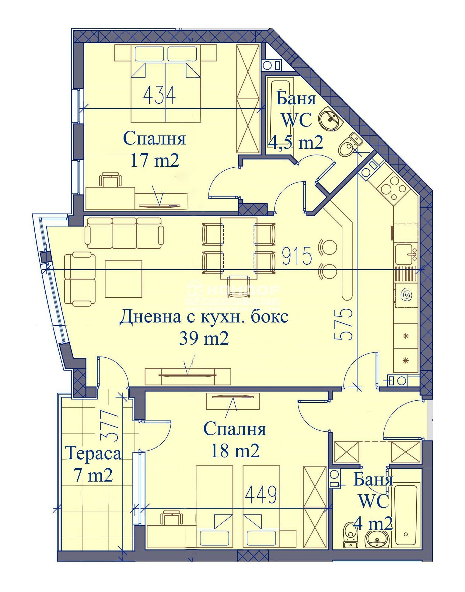 Оферта 54076: ГОТОВА СГРАДА!!! Уникални просторни жилища, кабинети, офиси и търговски площи за продажба в НОВА ЕМБЛЕМАТИЧНА СГРАДА в непосредствена близост до паркова среда, на метри от Гребната база! Ще бъде короната в перлата на квартала, който става все по-предпочитана локация. Апартаментът, който Ви предлагаме за покупка е с югозападно изложение, състои се от дневна с трапезария и кухненски бокс, с френски панорамни прозорци - 38 м2, детска спалня - 18 м2, една тераса имаща излаз от двете стаи - 7 м2, родителска спалня - 17 м2 със собствена баня с тоалетна, втора баня с тоалетна и входно антре. Осигурени паркоместа в контролиран, обширен подземен паркинг - достатъчни да задоволят нуждите на съвременните семейства, които често разполагат с повече от една кола. При проектирането на сградата умело е съчетано безкомпромисно качество, отлична локация, безупречен стил, задоволяващ най-високите изисквания на крайния потребител. Жилищата са издадени в степенност: стени и тавани гипсова мазилка; под - циментова замазка. Стълбище и коридори - гранитогрес, входни врати на апартаменти блиндирани; външна топлоизолация, пет камерна PVC дограма с високи изолационни показатели за ниски енергийни разходи - клас А, електро инсталации осветление, оптична връзка за цифрова телевизия и интернет, домофонна инсталация, мълниезащитна заземителна инсталация, заготовка за климатици, ВИК изпълнена с полипропиленови шумопоглъщащи тръби до тапа, топлоизолирана и антикондензна защита. Контрол и поддръжка на общите части (градинки, огради и вътрешна улица на сградата). Осигурено банково кредитиране на преференциални условия за всички наши клиенти.